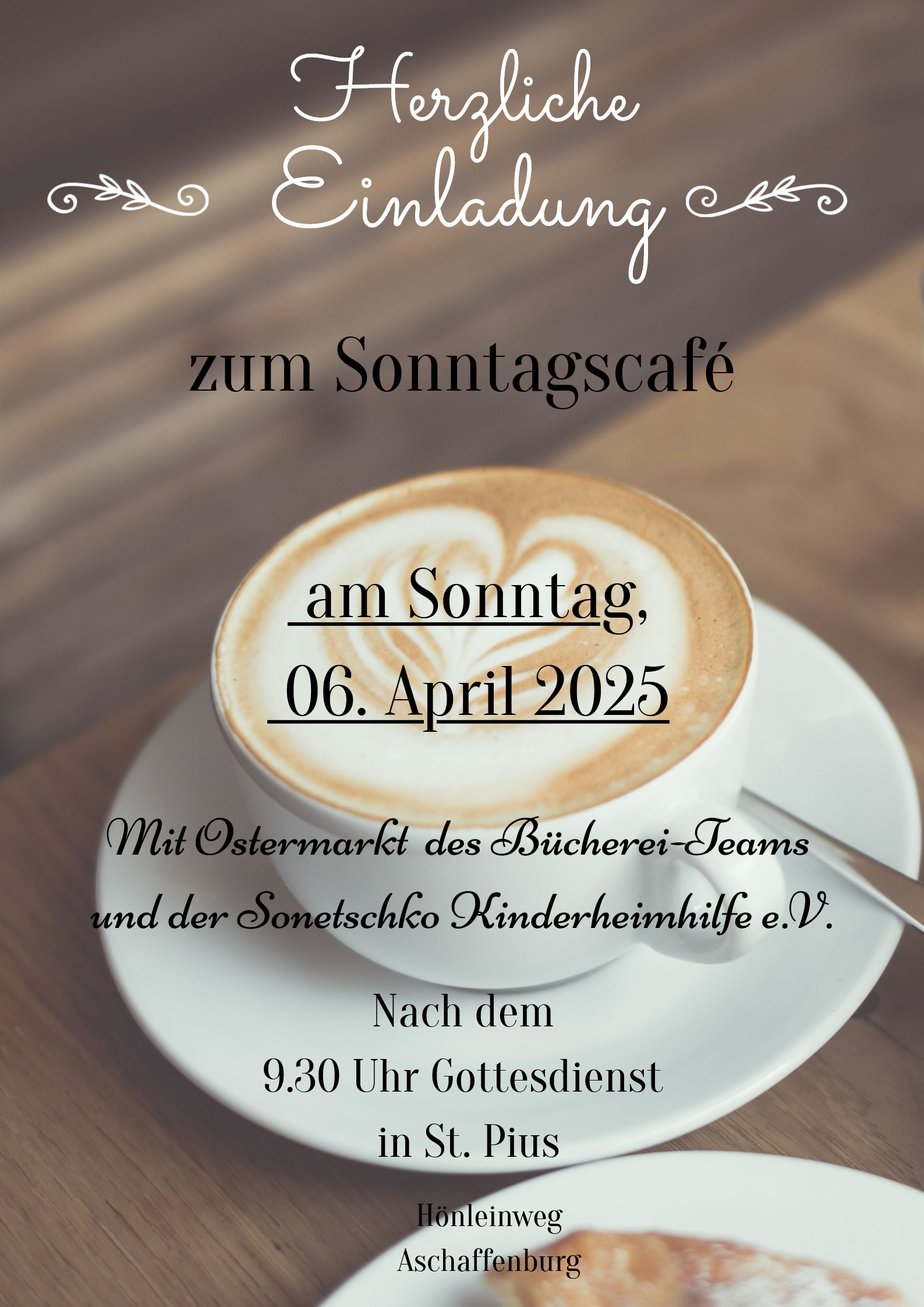 Herzliche Einladung zum Sonntagscafé nach dem Gottesdienst in der St. Pius-Kirche (Beginn 9.30 Uhr) am 6. April gegen 10.30 Uhr im Pfarrsaal oder bei schönem Wetter auf dem Kirchplatz. Gleichzeitig bieten das Team unserer Bücherei sowie unser Organist Robert Eidenschink beim Ostermarkt wieder selbstgefertigte Osterartikel und kleine Ostergeschenke an. Der Erlös kommt der Bücherei und der Sonetschko-Kinderheimhilfe e.V. zugute. Wir freuen uns auf Ihren Besuch!