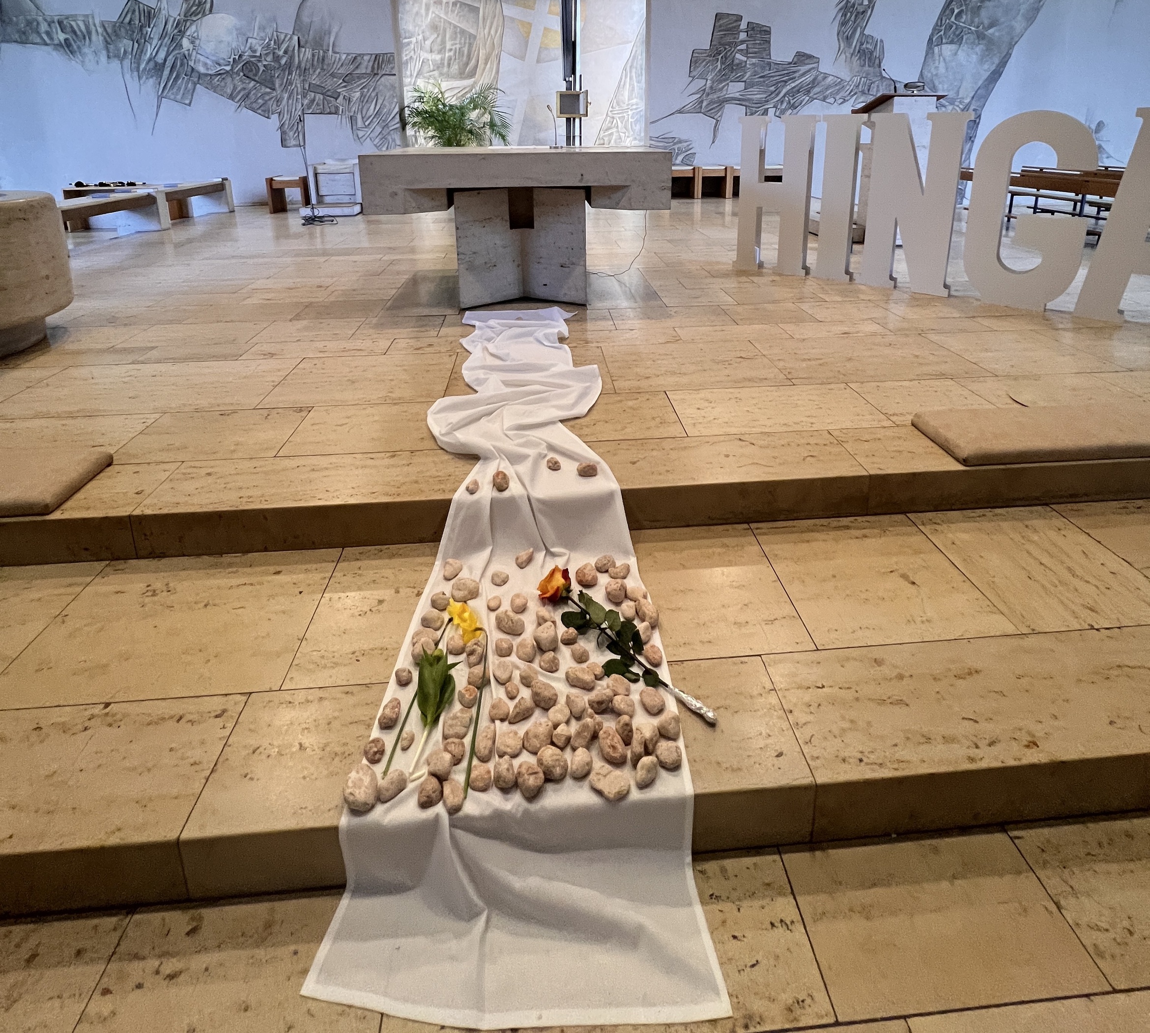 HINGABE - in großen Lettern prangte dieses Wort in der St.-Pius-Kirche am Karfreitag. In der Feier des Leidens und Sterbens Christi hörten die Gläubigen die Passionsgeschichte, legten auf dem weißen Leinentuch, das das neue Kreuz in der Kirche zuvor verhüllt hatte, jeweils einen Stein ab - als Zeichen für all das, was in unserem Leben schwer ist, was uns sorgt, traurig macht und belastet.