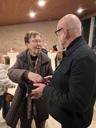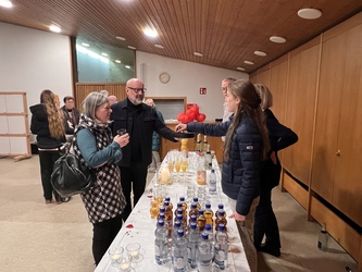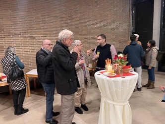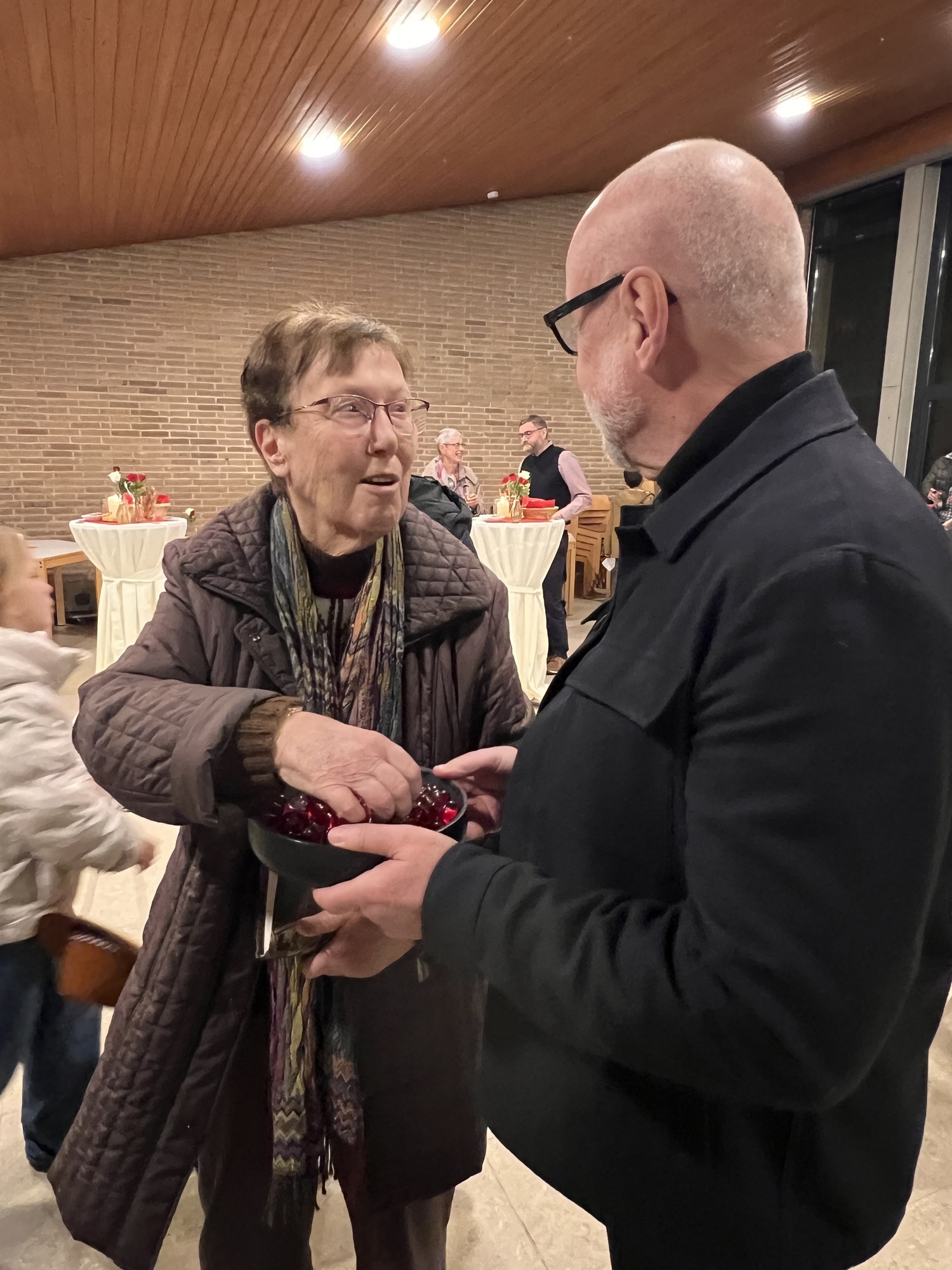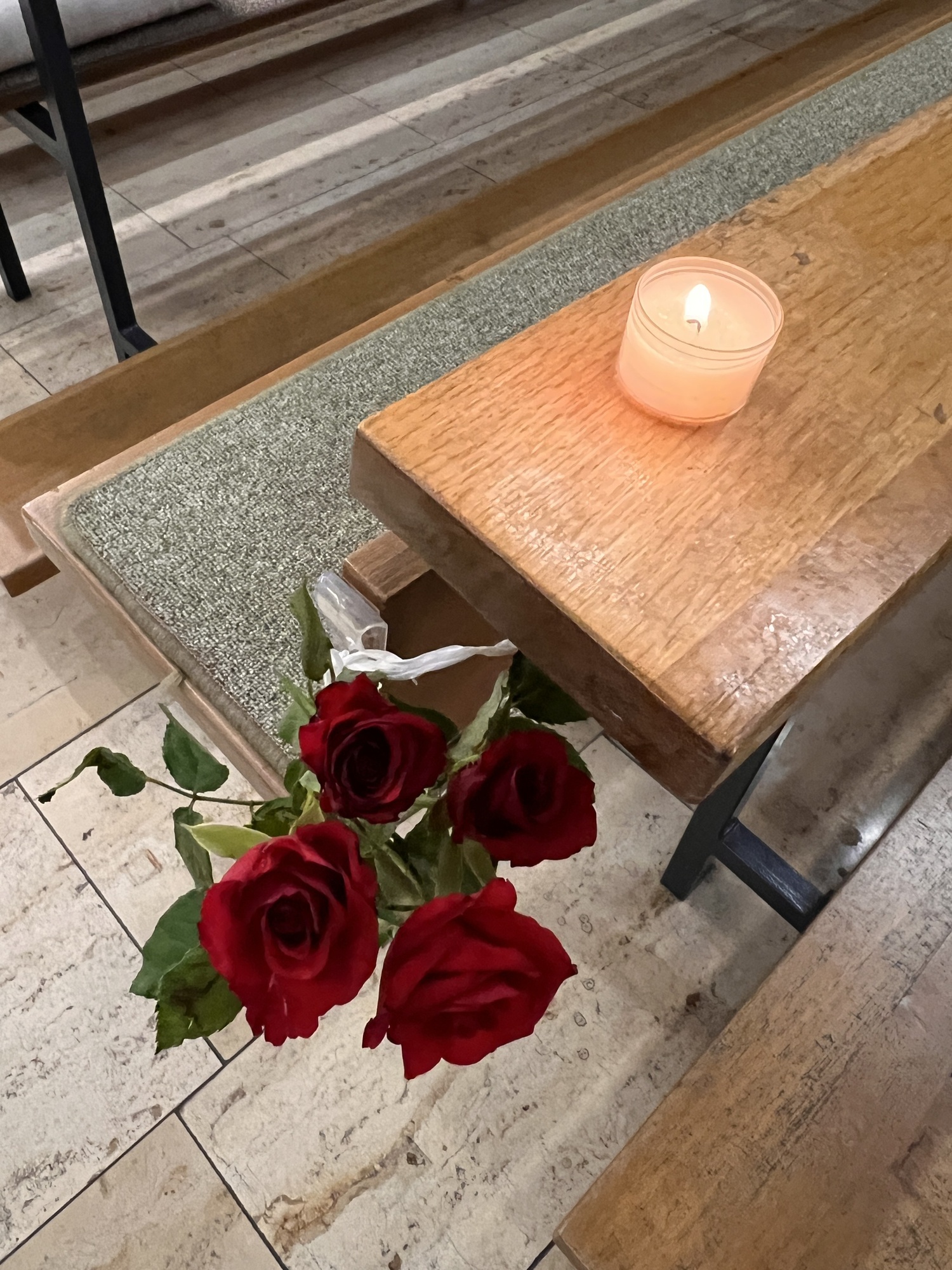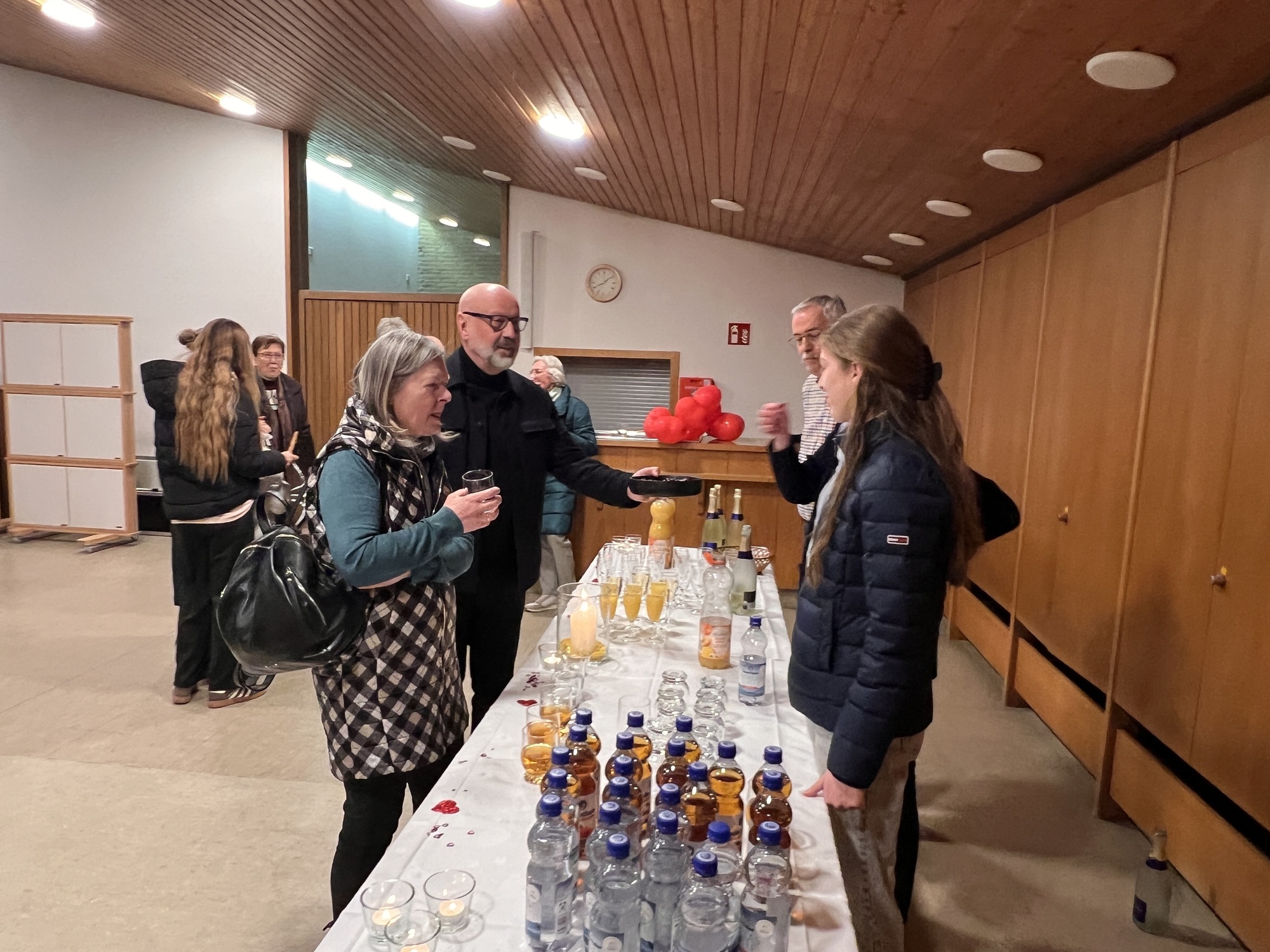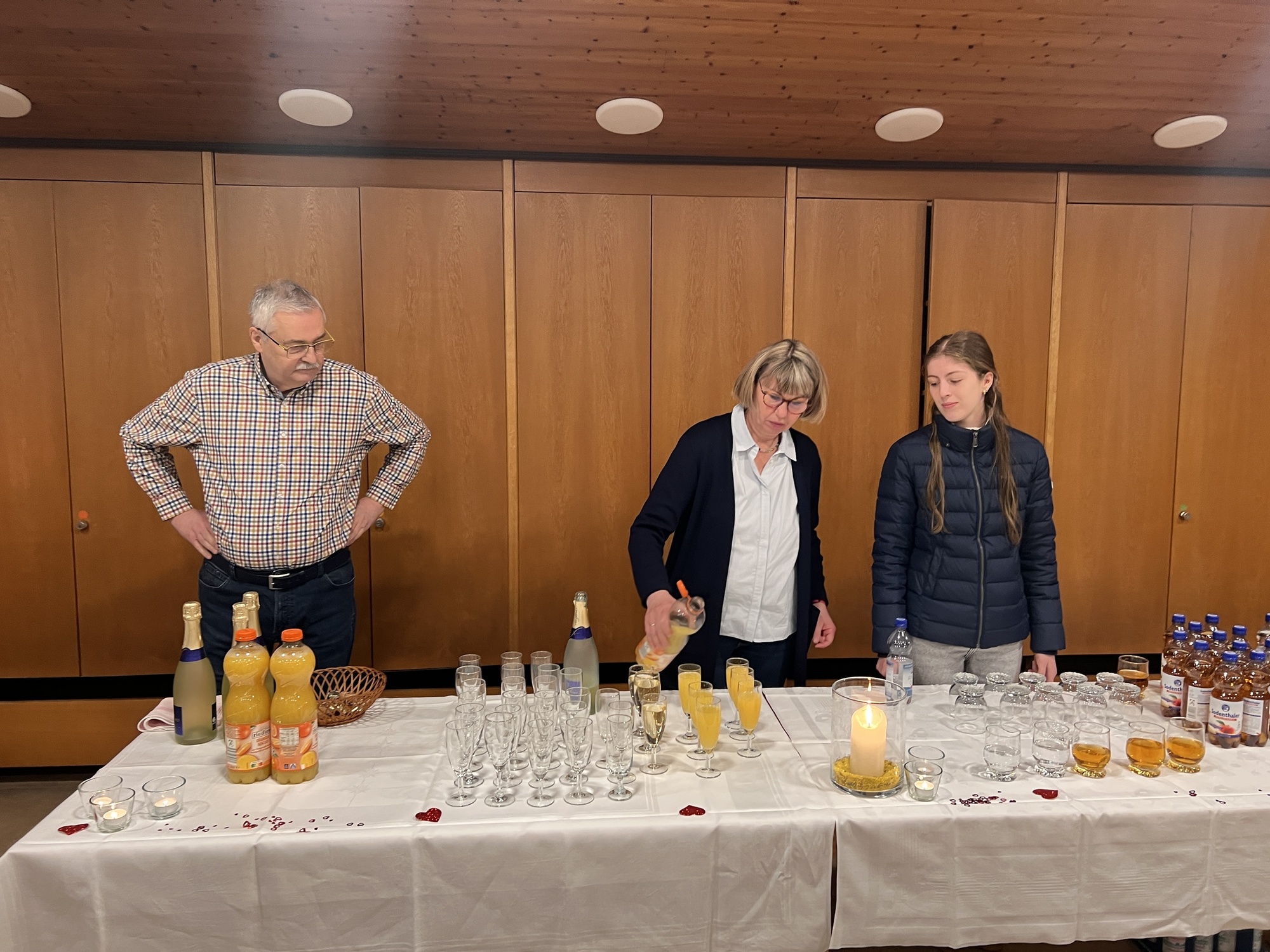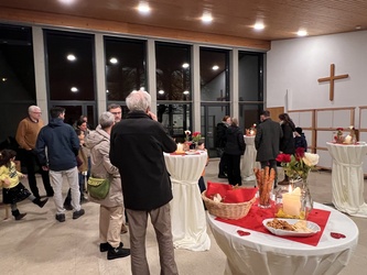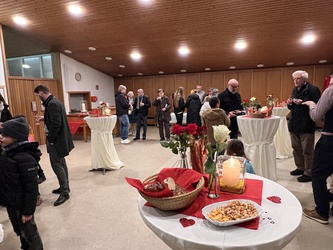 Beim Sektempfang, der im Anschluss an die Messfeier im Pfarrsaal stattfand, gab es dann ausreichend Gelegenheit zum Gespräch. Danke an alle, die die Kirche so schön mit Rosen, Lichtern und Herzluftballons geschmückt haben und die Bewirtung übernommen haben. comü