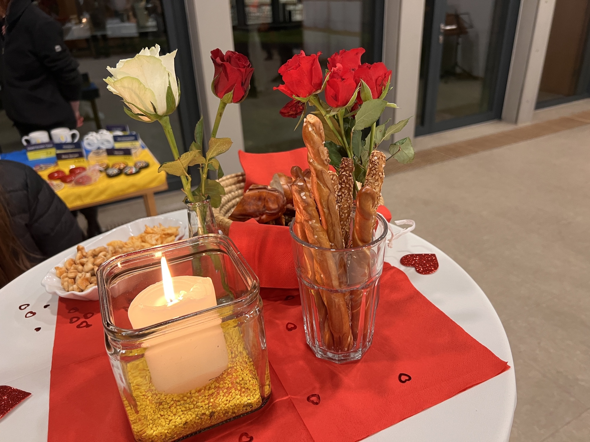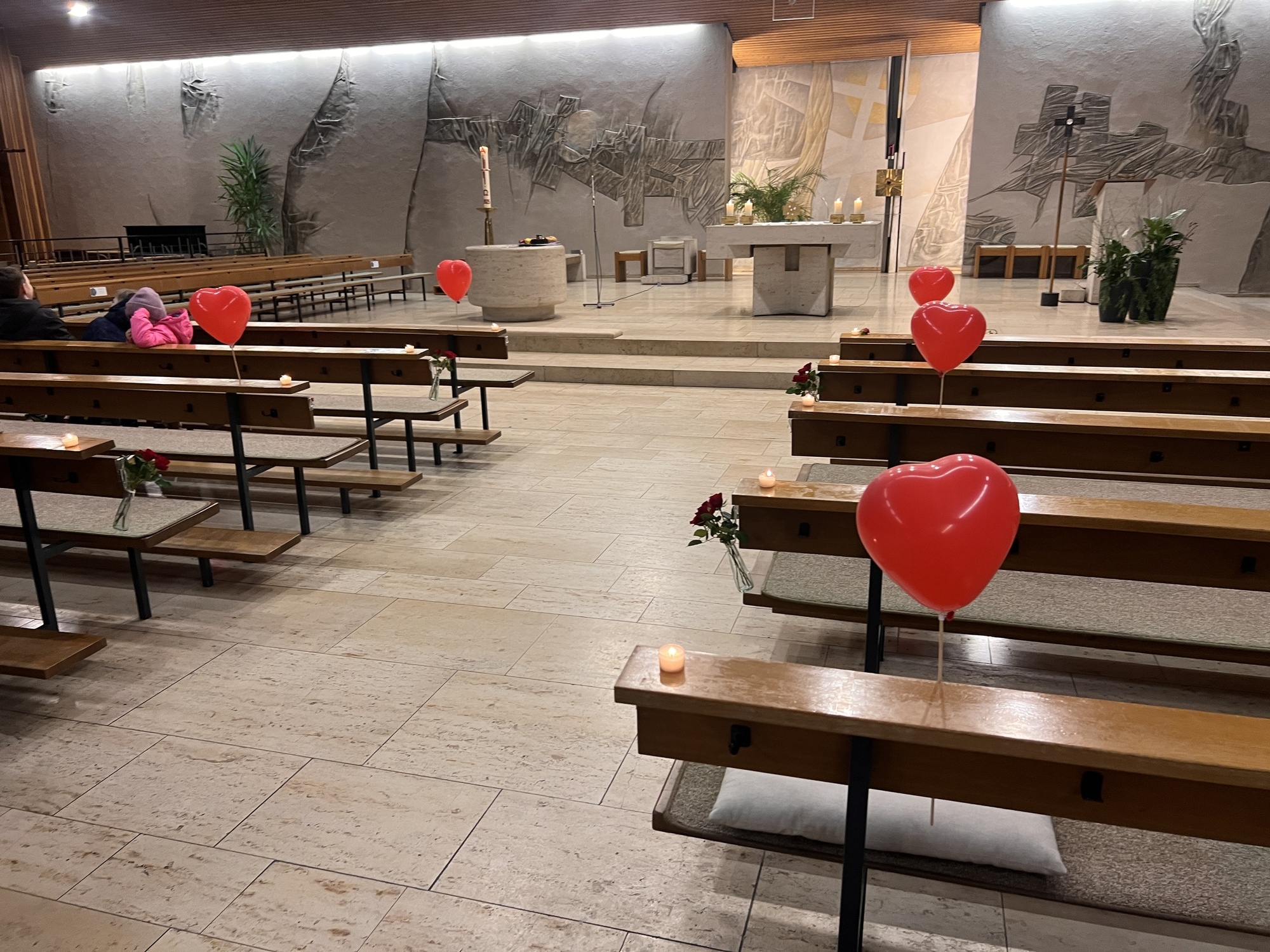 Erneut war die St. Pius-Kirche wieder mit Luftballons in Herzform, roten Rosen und Kerzen geschmückt, ein schöner Rahmen. Diakon Völker hatte einen Teller voller verschiedener Lebensmittel mitgebracht für seinen Impuls. Hier ein Ausschnitt: „Sie kennen wahrscheinlich alle die oft gestellte Frage „Hat‘s geschmeckt?“ So werden wir im Restaurant nach unserem Wohlbefinden gefragt oder man probiert zuhause ein neues Gericht aus und stellt die Frage in die Runde derer, die am Tisch sitzen.