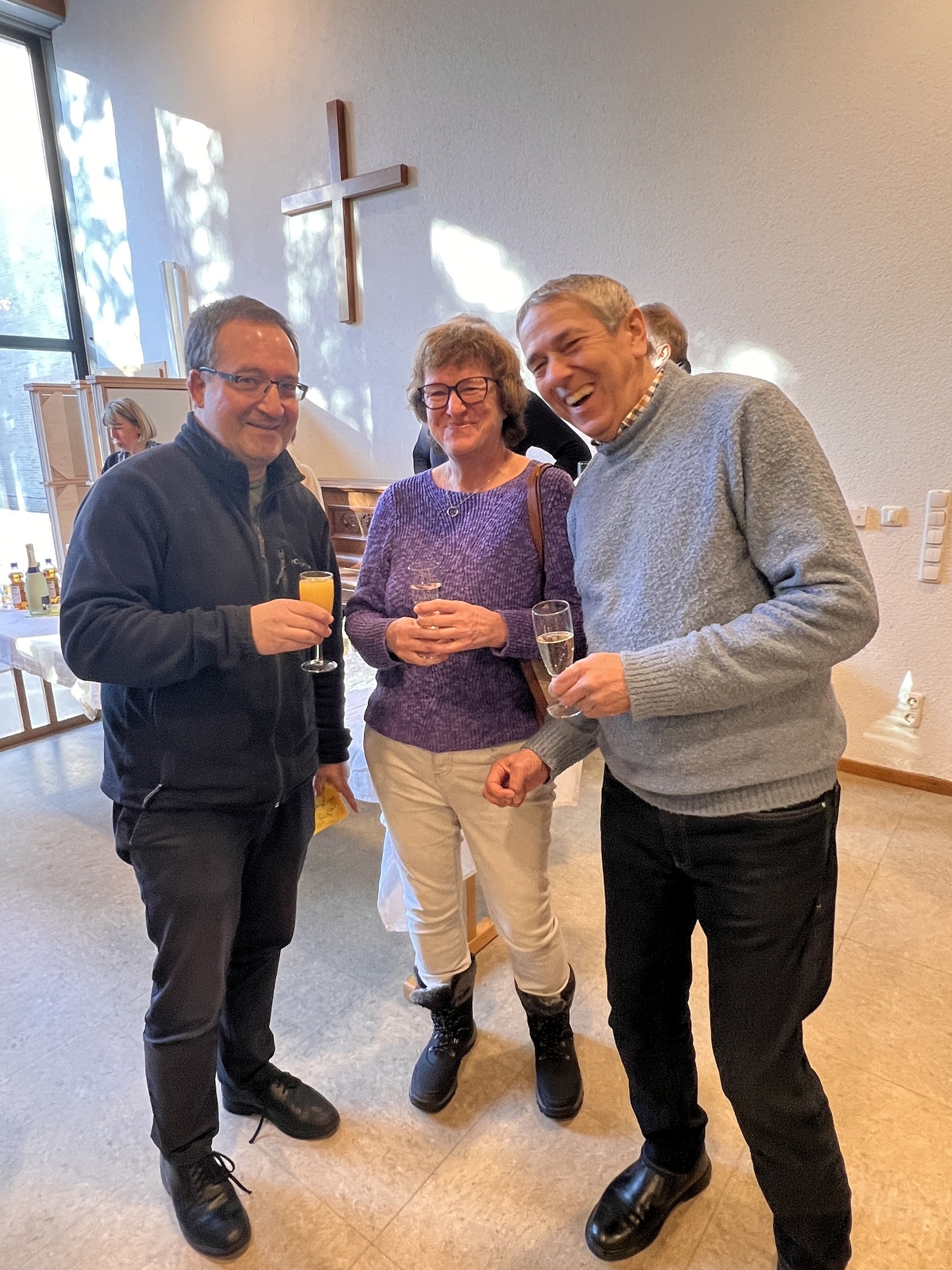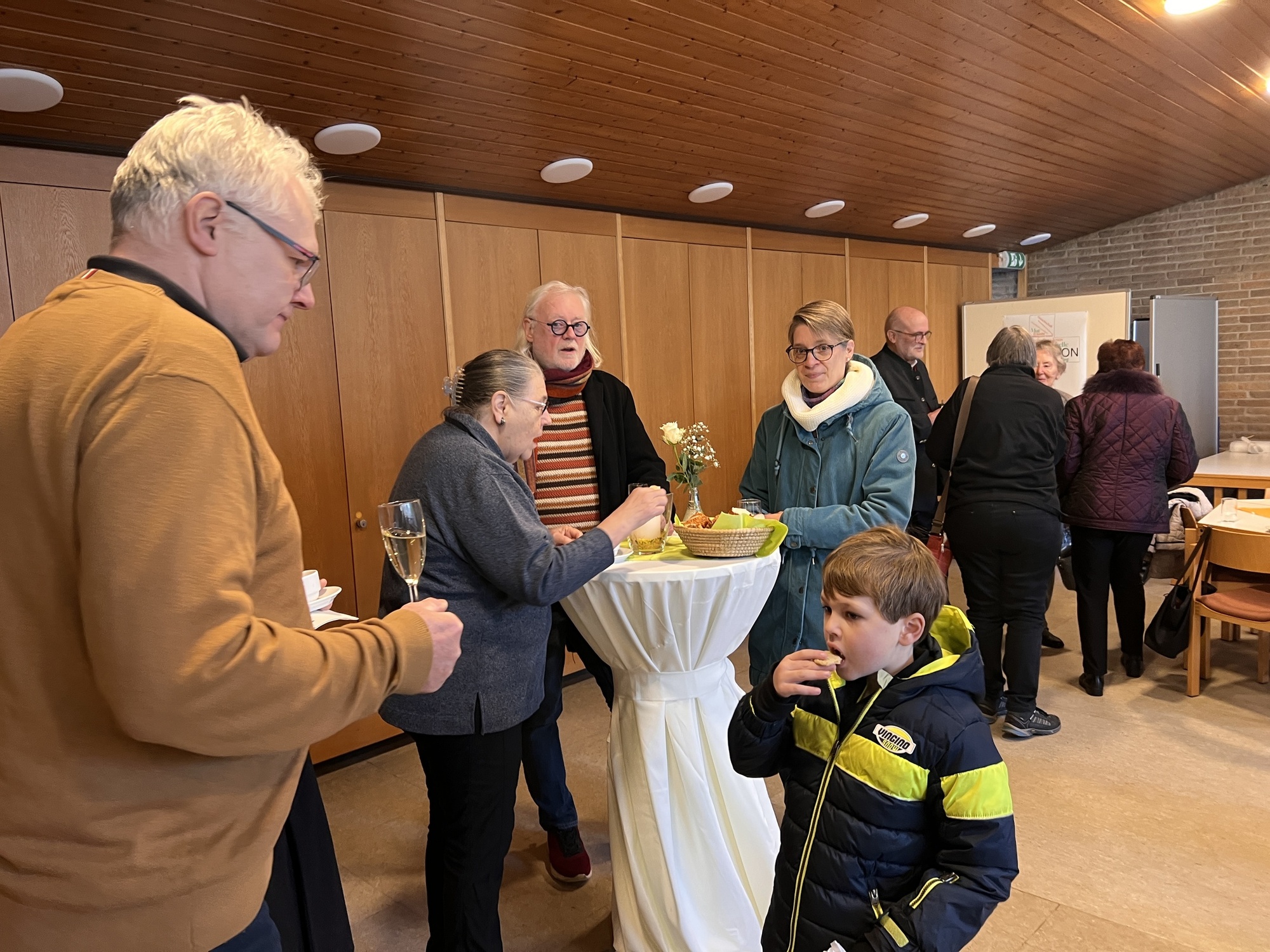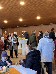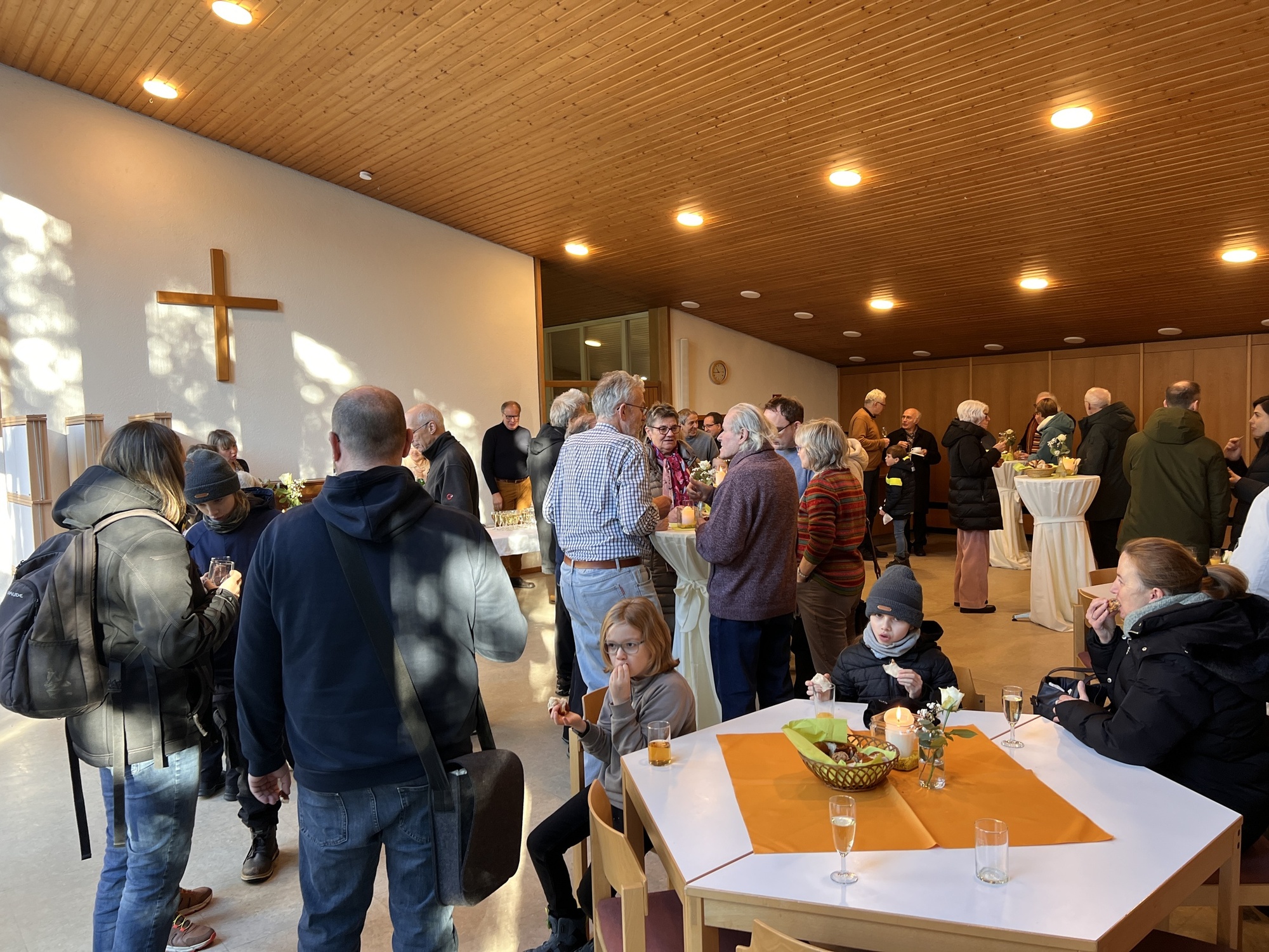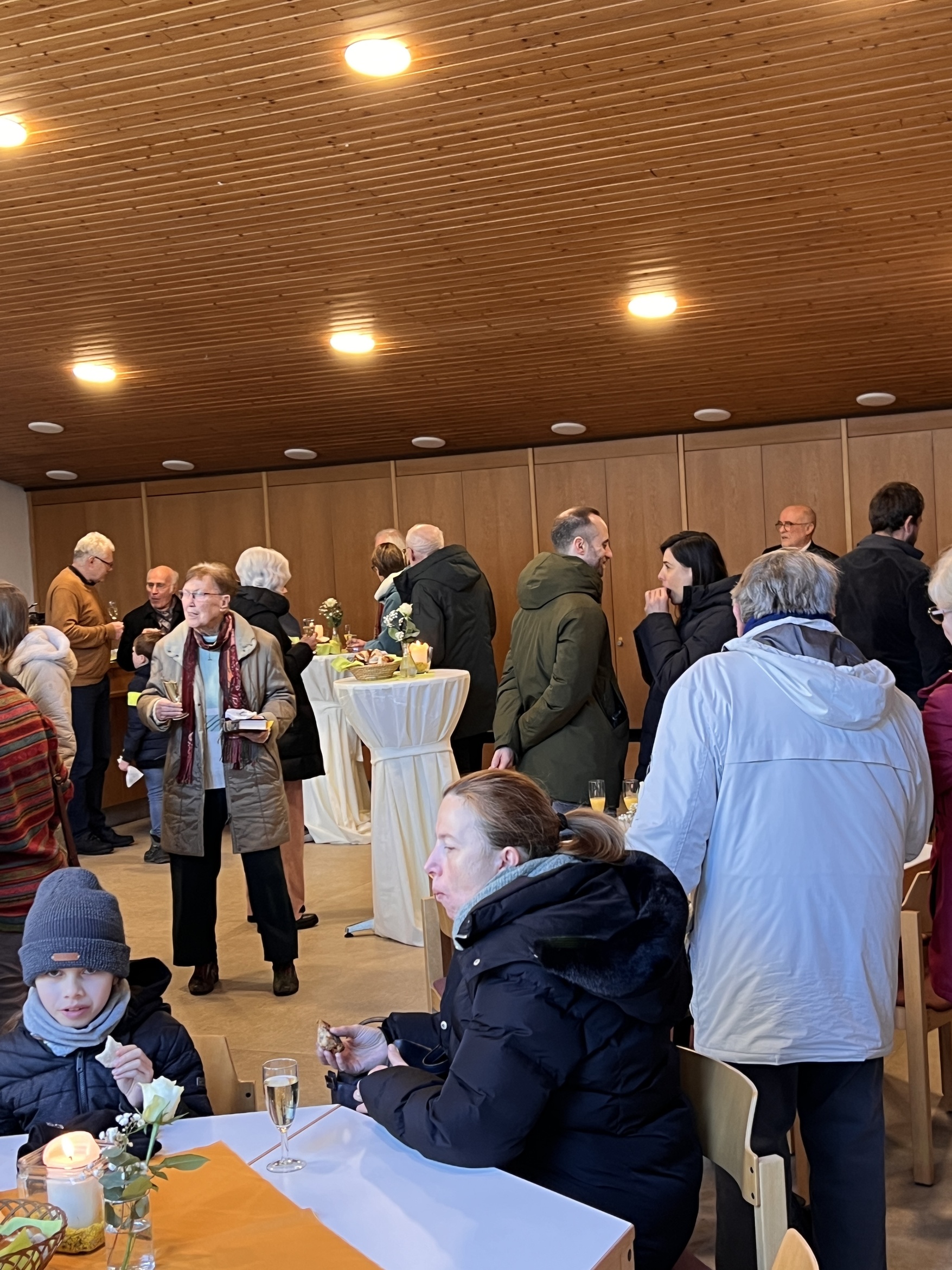 Zeit zur Begegnung, Zeit zum Reden und für jede Menge guter Wünsche war dann im Pfarrsaal beim Sektempfang. Vorträge oder Ansprachen gab es wieder bewusst nicht, um Gelegenheit zum Austausch zu haben. Bei einem Glas Sekt, alkoholfreien Getränken und Gebäck nutzten rund 80 Besucherinnen und Besucher diese Gelegenheit. Besten Dank allen Helferinnen und Helfern für diesen Dienst!