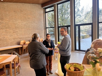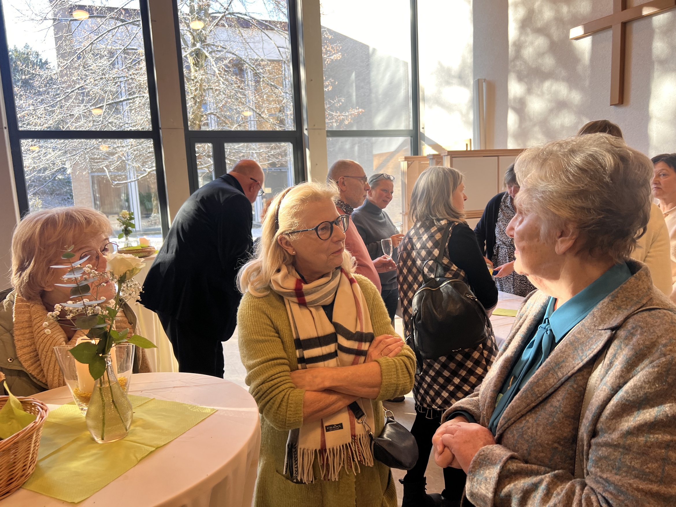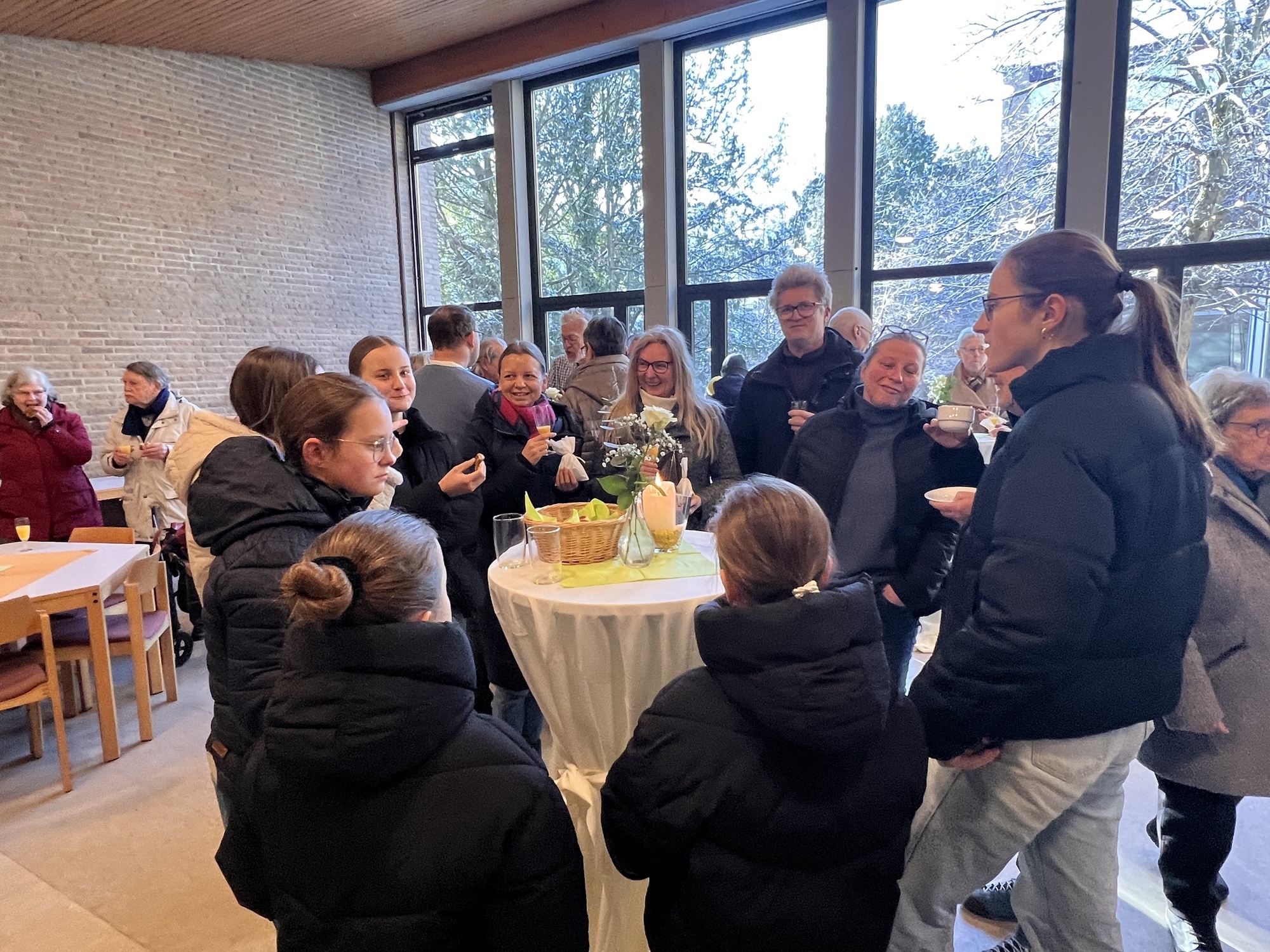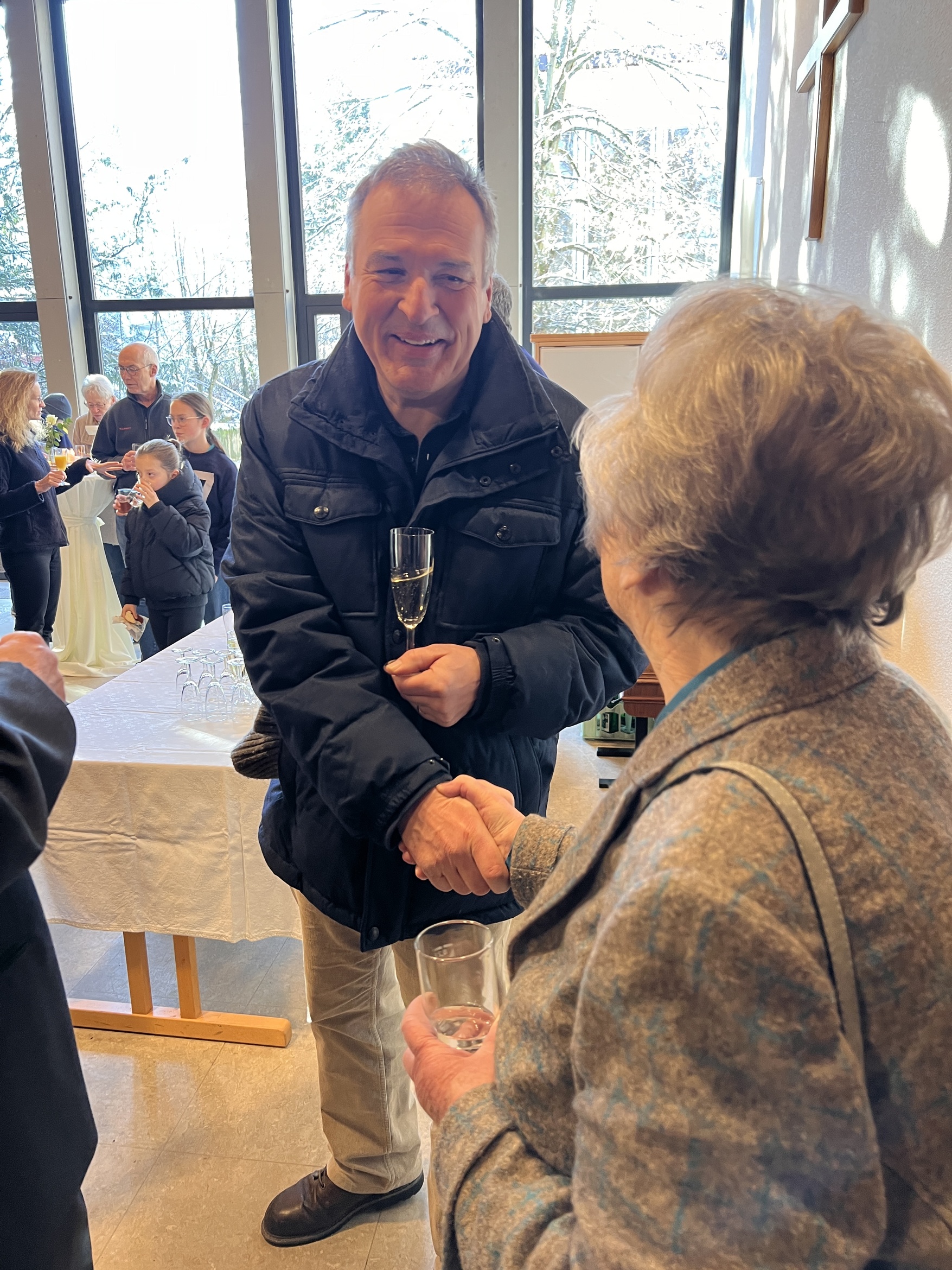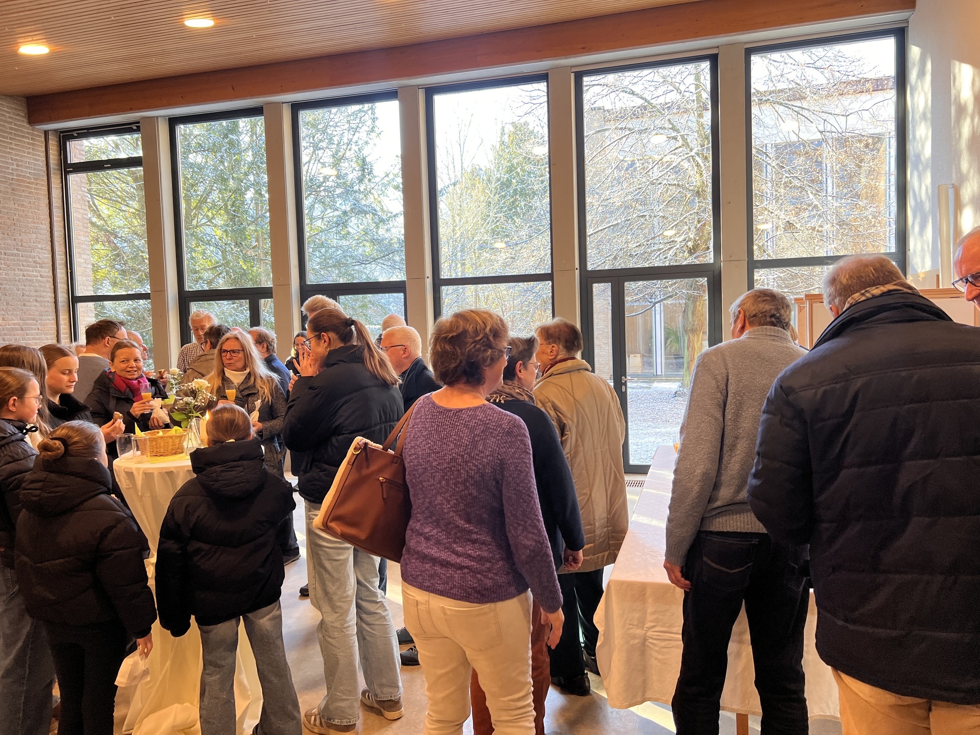 Zeit zur Begegnung, Zeit zum Reden und für jede Menge guter Wünsche war dann im Pfarrsaal beim Sektempfang. Vorträge oder Ansprachen gab es wieder bewusst nicht, um Gelegenheit zum Austausch zu haben. Bei einem Glas Sekt, alkoholfreien Getränken und Gebäck nutzten rund 80 Besucherinnen und Besucher diese Gelegenheit. Besten Dank allen Helferinnen und Helfern für diesen Dienst!