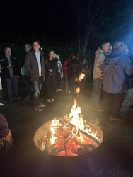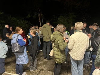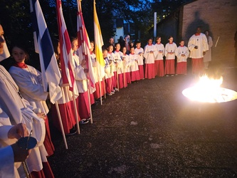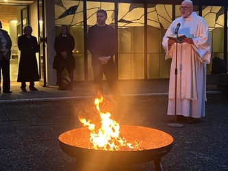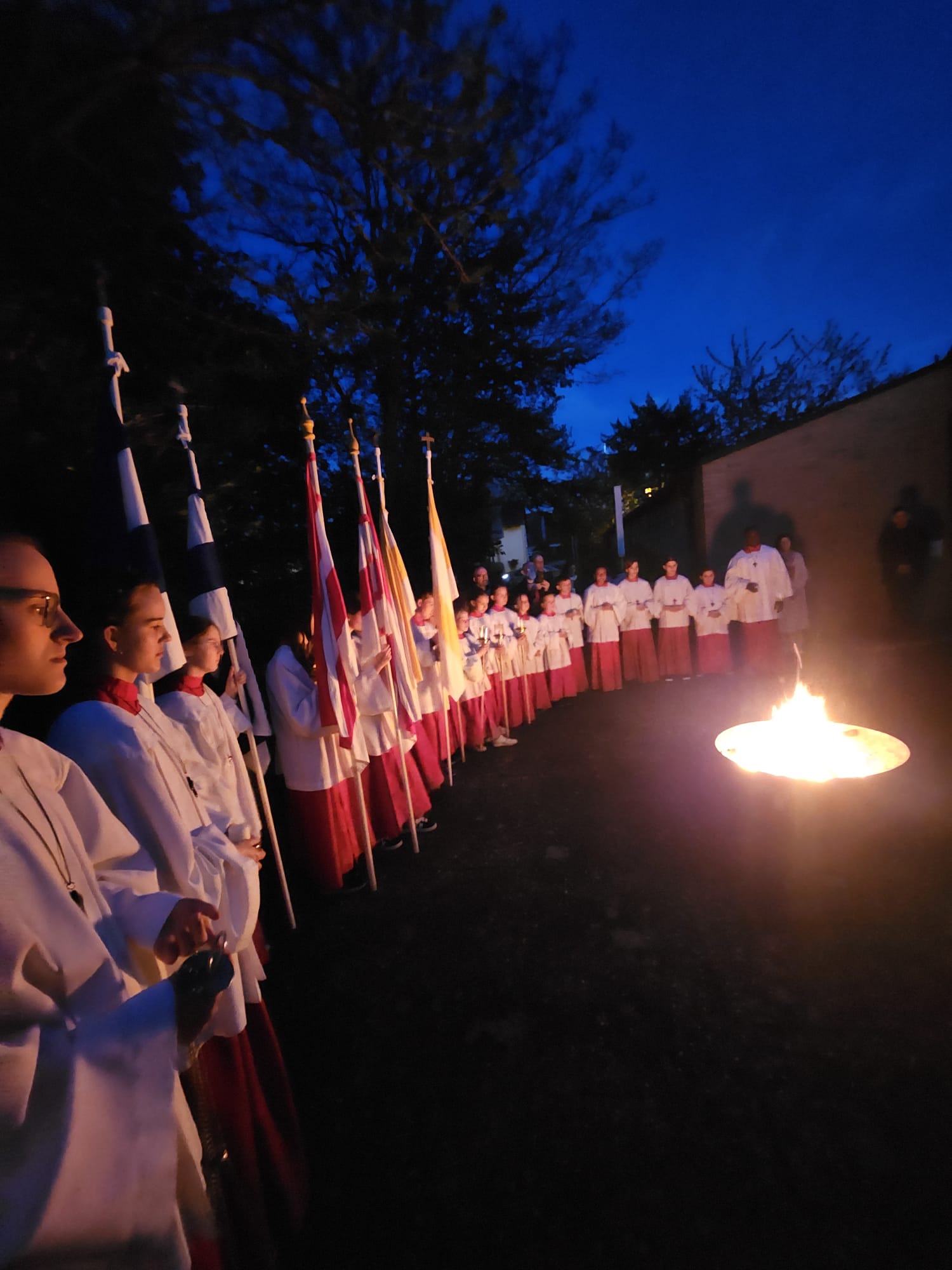 Ums Osterfeuer herum sammelte sich dann vor der Osternacht in St. Pius die Gemeinde, begleitet von Gesang eines Quartetts und mit Texten von Diakon Völker.