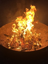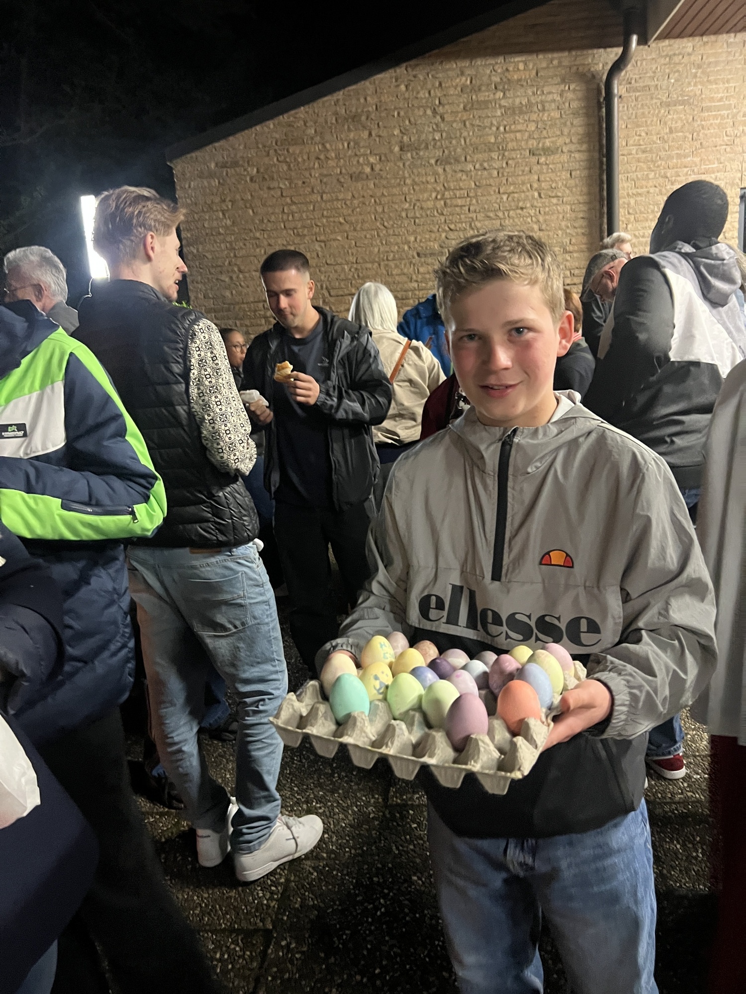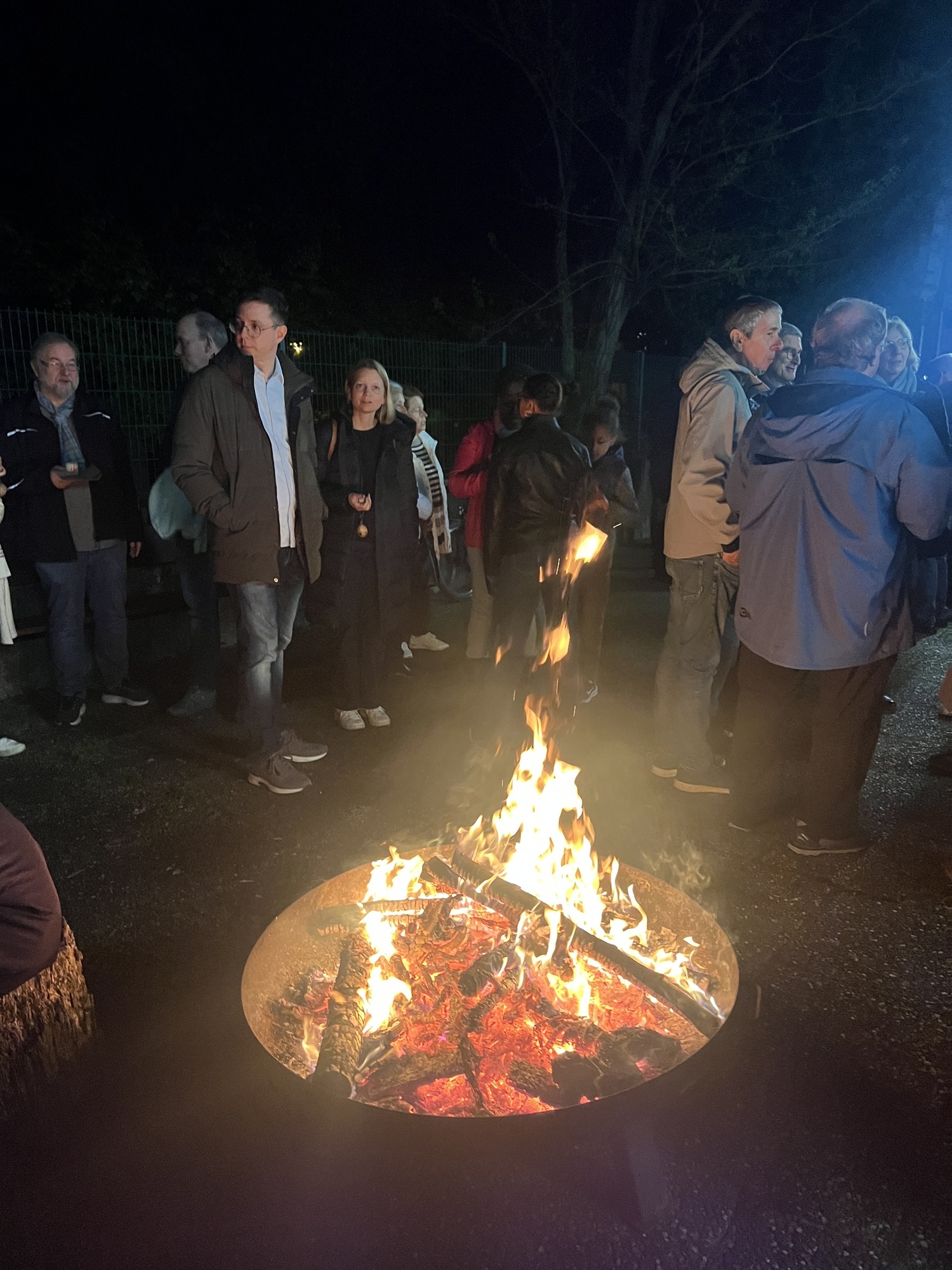 Die beiden neuen Osterkerzen, die Robert Eidenschink zum nunmehr 13. Mal wieder eindrucksvoll fü beide Kirchen gestaltet und gespendet hat, wurden geweiht. Mit dem Ruf „Lumen Christi“ zog das Licht in die dunkle Kirche. Auch nach der wunderschönen Auferstehungsfeier gab es ein Symbol zum Mitnehmen: ein kleines Holzei, als Zeichen des Lebens. Im Anschluss war viel Zeit für Begegnung und Bewirtung rund ums Osterfeuer.