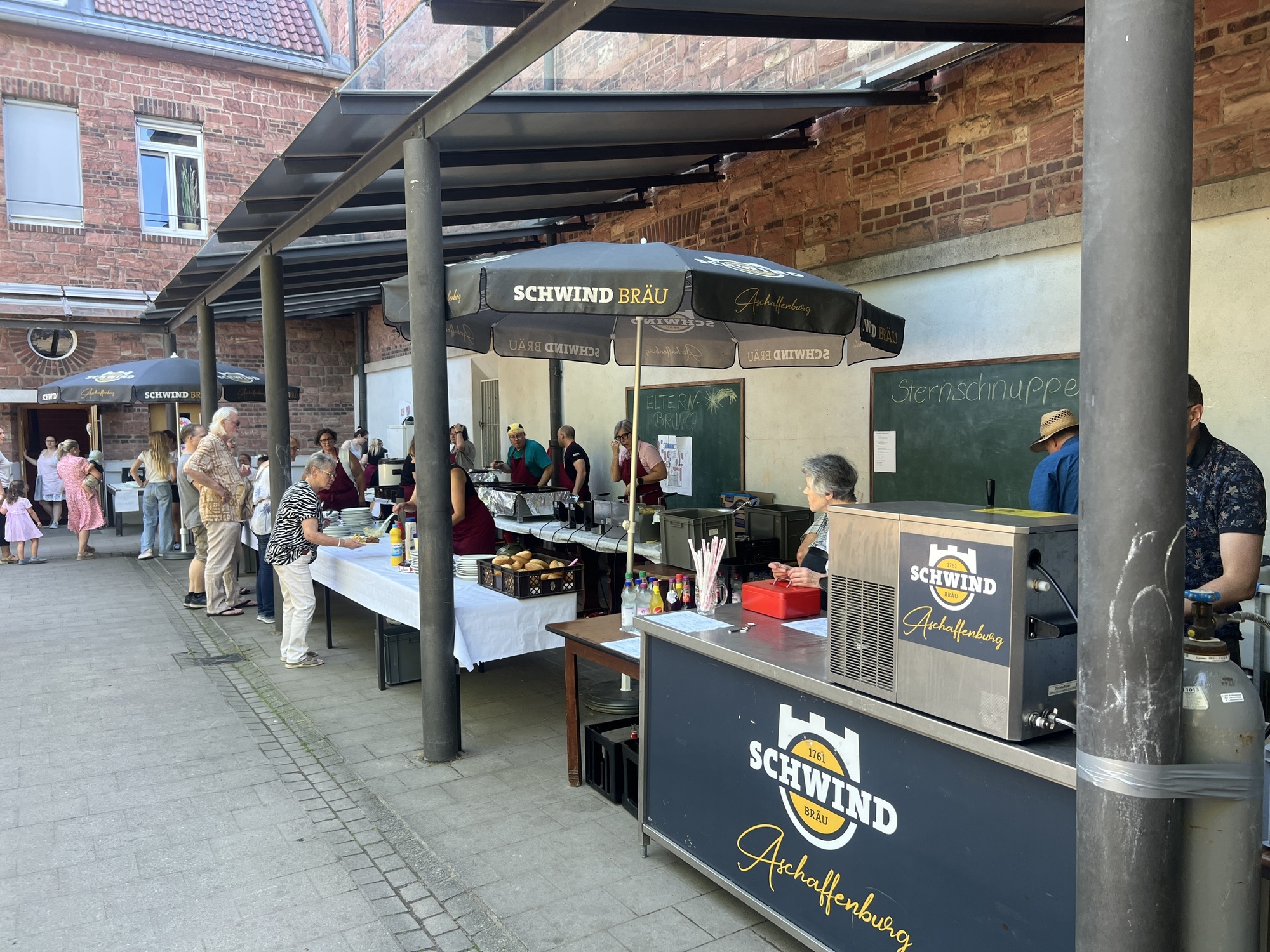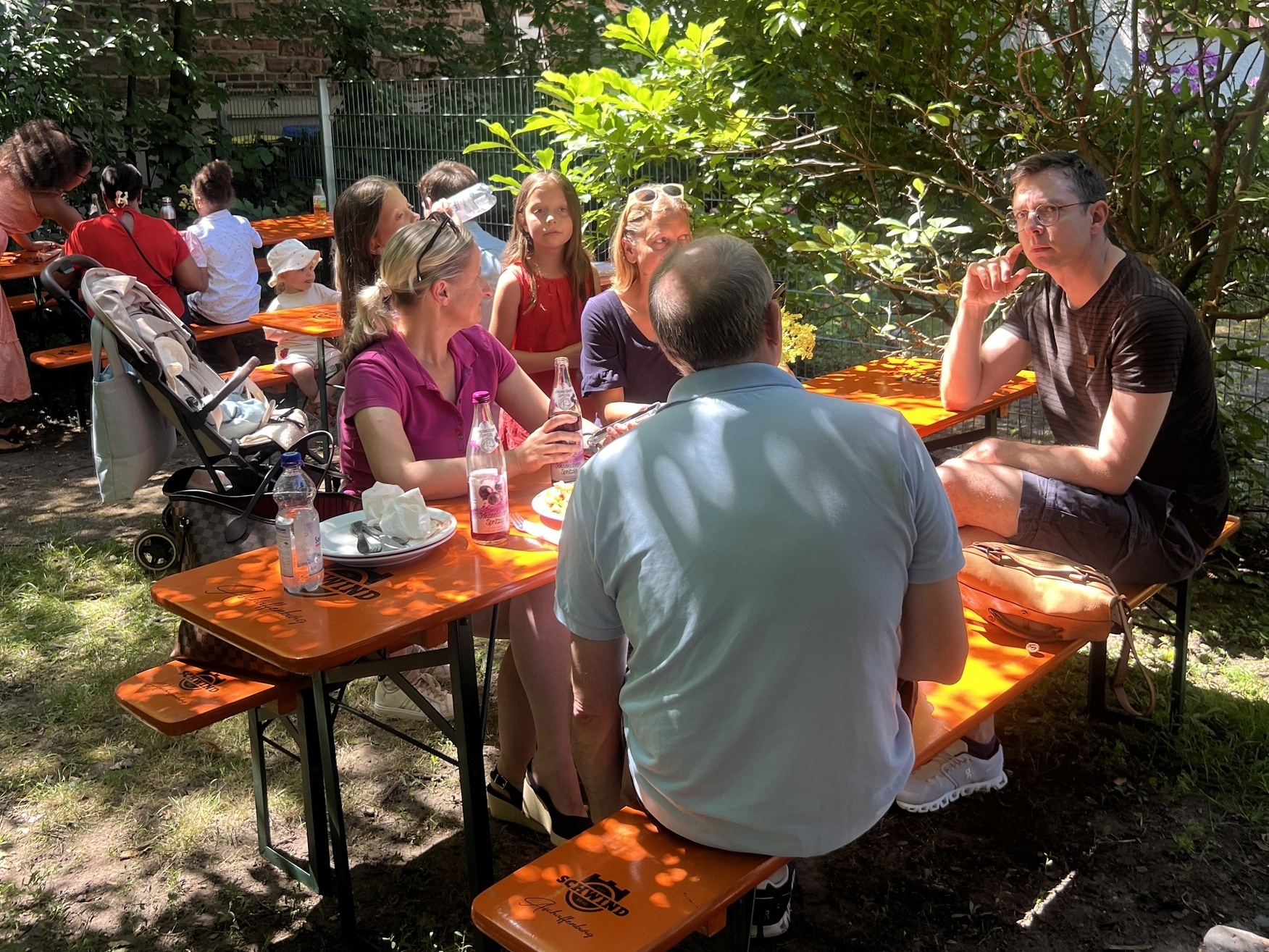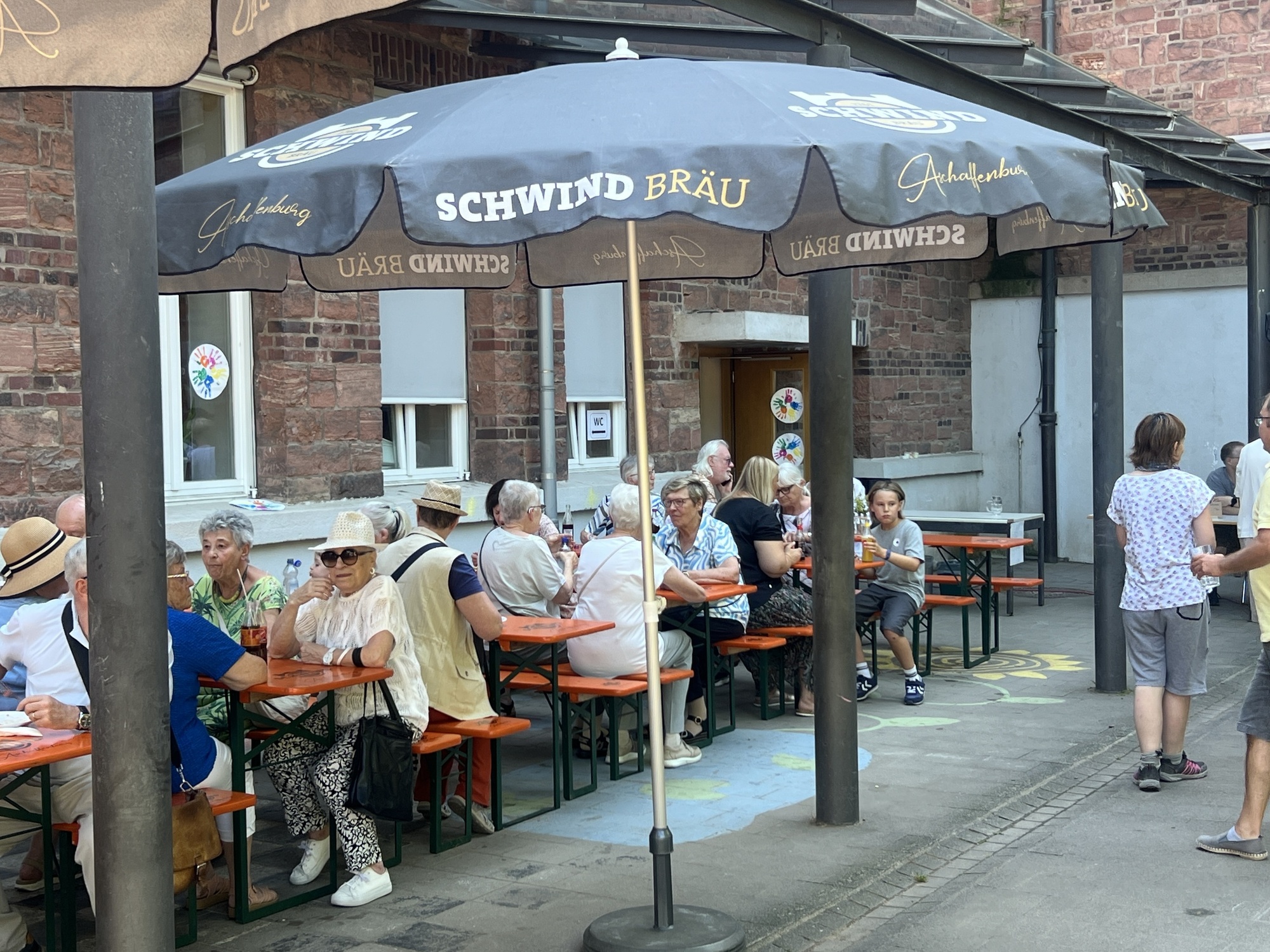 Zum gemeinsamen Pfarrfest hat die Pfarreiengemeinschaft Zum guten Hirten wieder am letzten Juniwochenende eingeladen. Zwei Tage lang feierten die Besucher rund um die Herz-Jesu-Pfarrkirche an der Saarstraße, und das bei viel Sonnenschein und Temperaturen um die 30 Grad. Los ging es bereits am Samstagnachmittag mit dem Sommerfest des Familienstützpunkts Innenstadt und der Kita Herz Jesu mit Spielmöglichkeiten, Kaffee und Kuchen. Am Abend startete dann das Pfarrfest, ebenfalls auf dem weitläufigen Gelände der Kita. Die Helferteams am Grill, der Essensausgabe, am Getränkeausschank, an der Kasse, am Kuchenstand, in der Küche und an der Spülmaschine sorgten für einen schönen, geselligen Abend. Musikalisch richtig gut unterhalten wurden die Gäste von Andi Herold und Silas Schmitt an Gitarre und Klavier.
