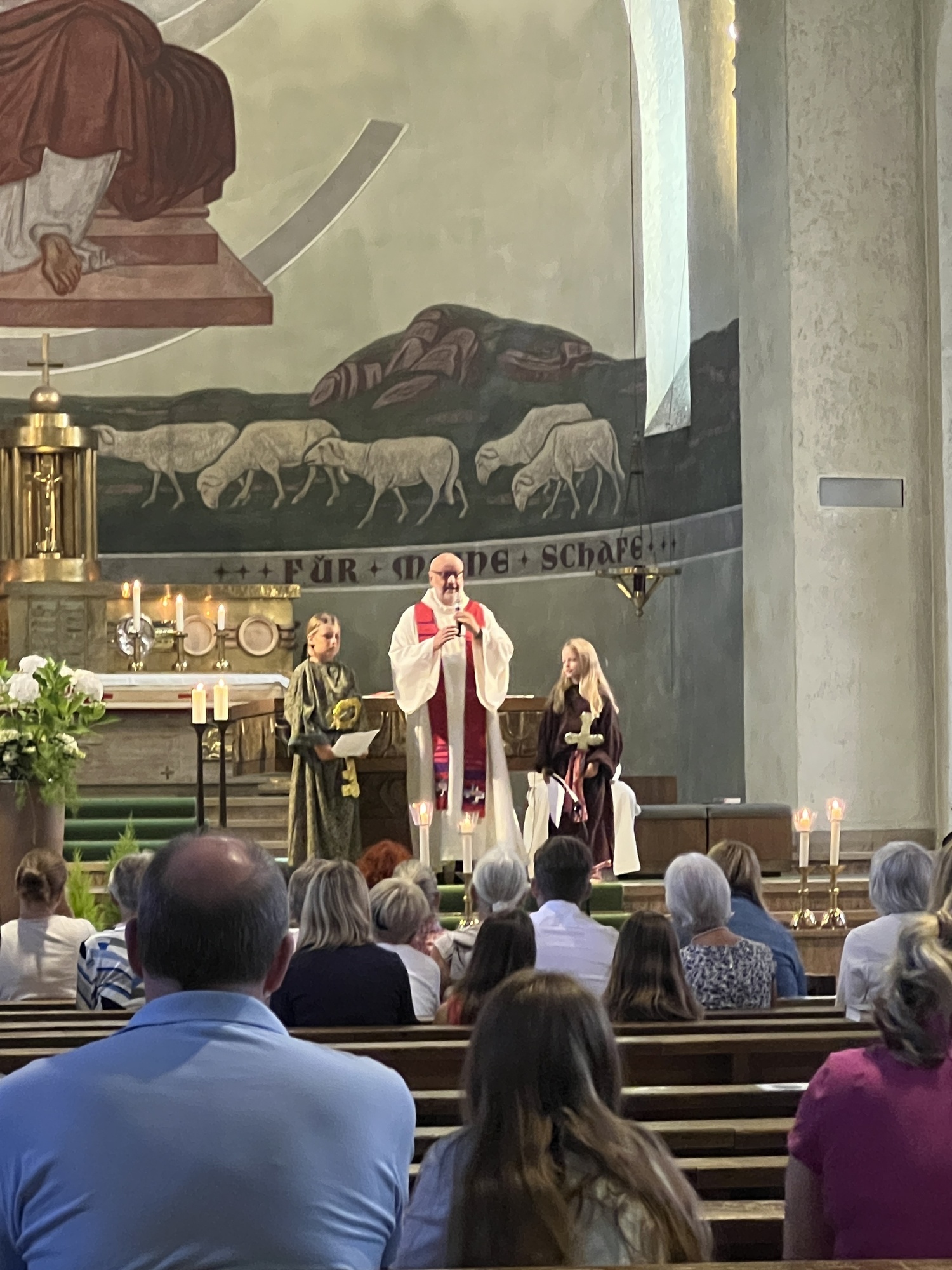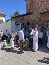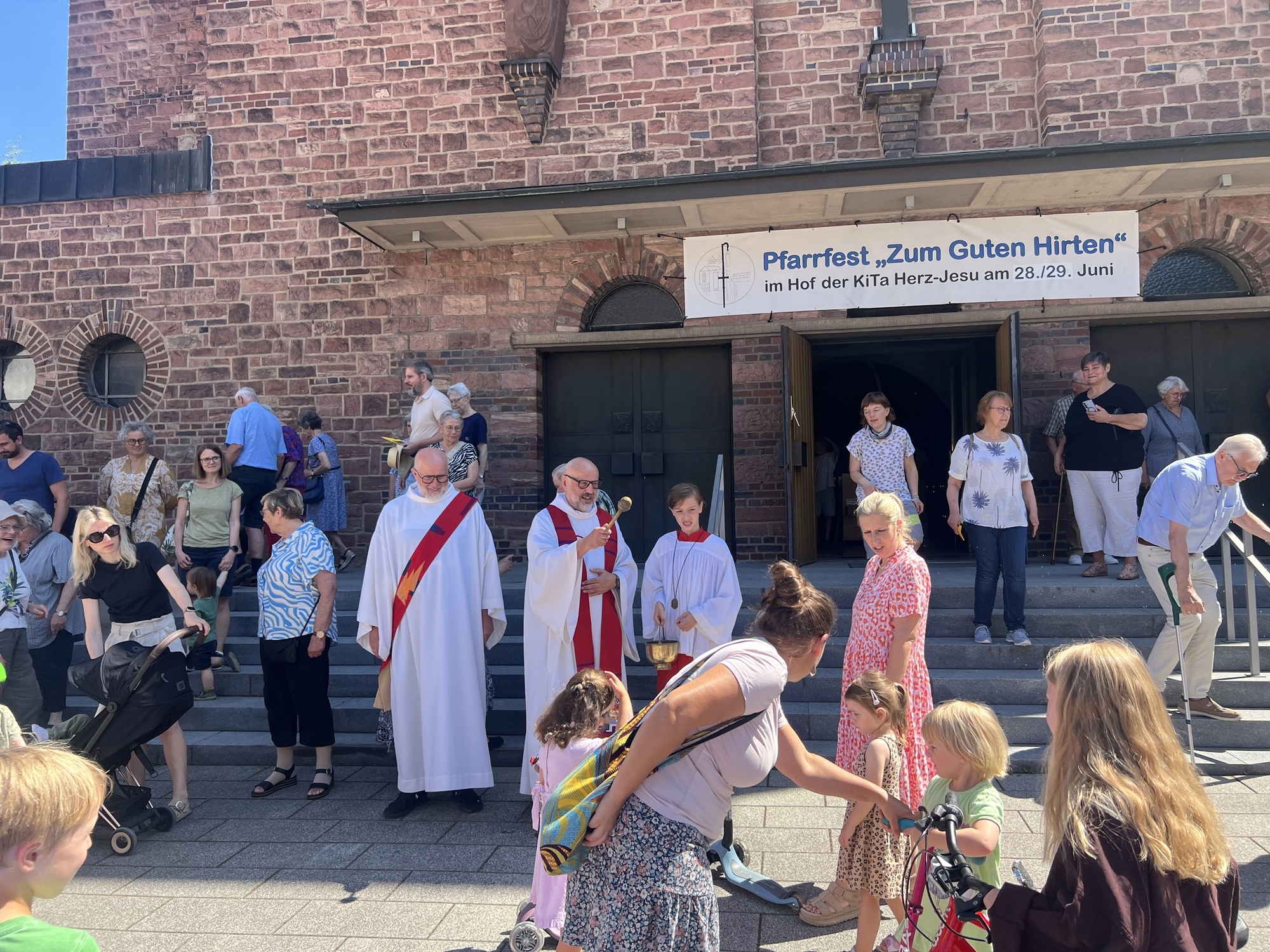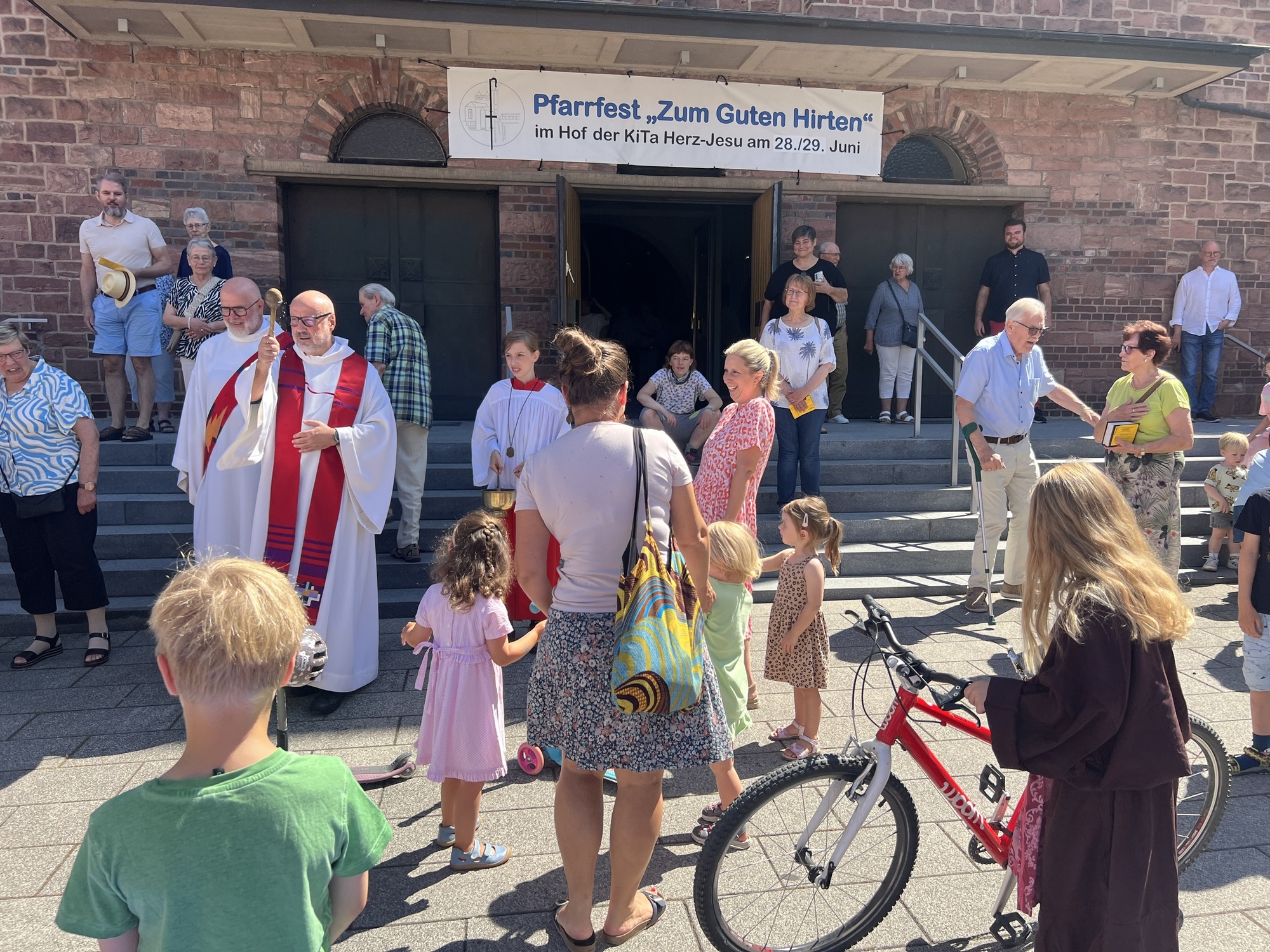 Der Festsonntag begann mit dem Familiengottesdienst in Herz-Jesu, zelebriert von Pfarrer Robert Sauer und Diakon Michael Völker sowie mit dem Team und den Kindern aus der Kita Herz Jesu, die mit einigen Liedern die Messe verschönerten. Anstelle einer Predigt spielten Greta und Jakob die beiden Apostel Paulus und Petrus, deren Gedenktag an diesem Wochenende gefeiert wurde, nach. Die beiden Kinder erzählten eindrucksvoll von deren Werdegang und ihrem Auftrag, Jesus nachzufolgen. Pfarrer Sauer ordnete das Wirken der Apostel kindgerecht ein und stellte die Freunde Jesu mit ihren ganz unterschiedlichen Charakteren vor.