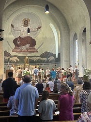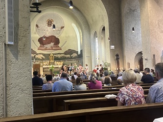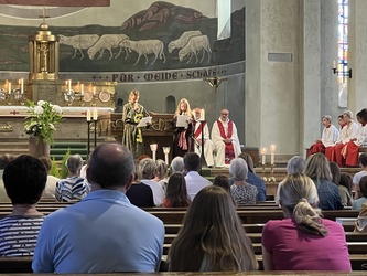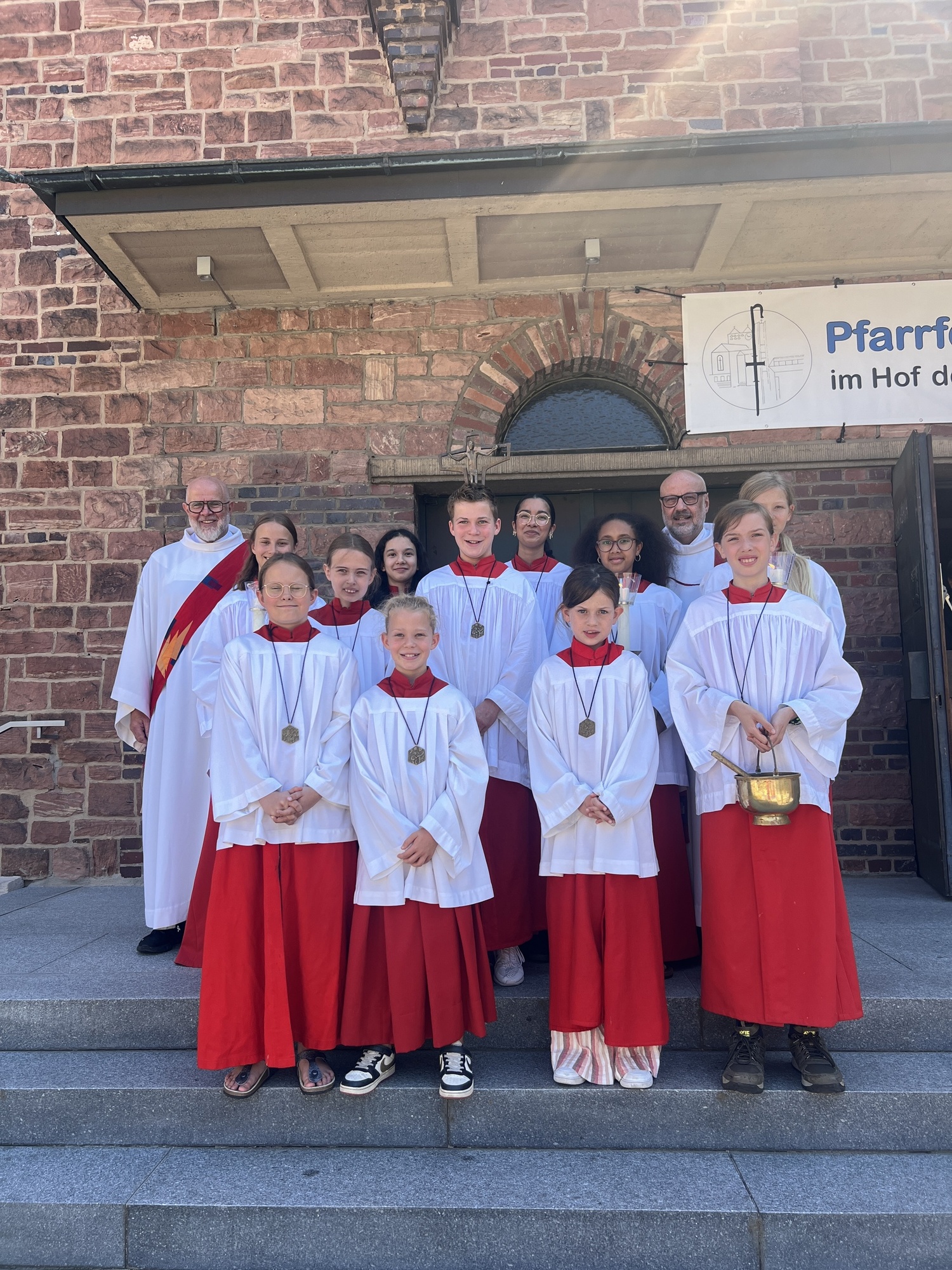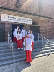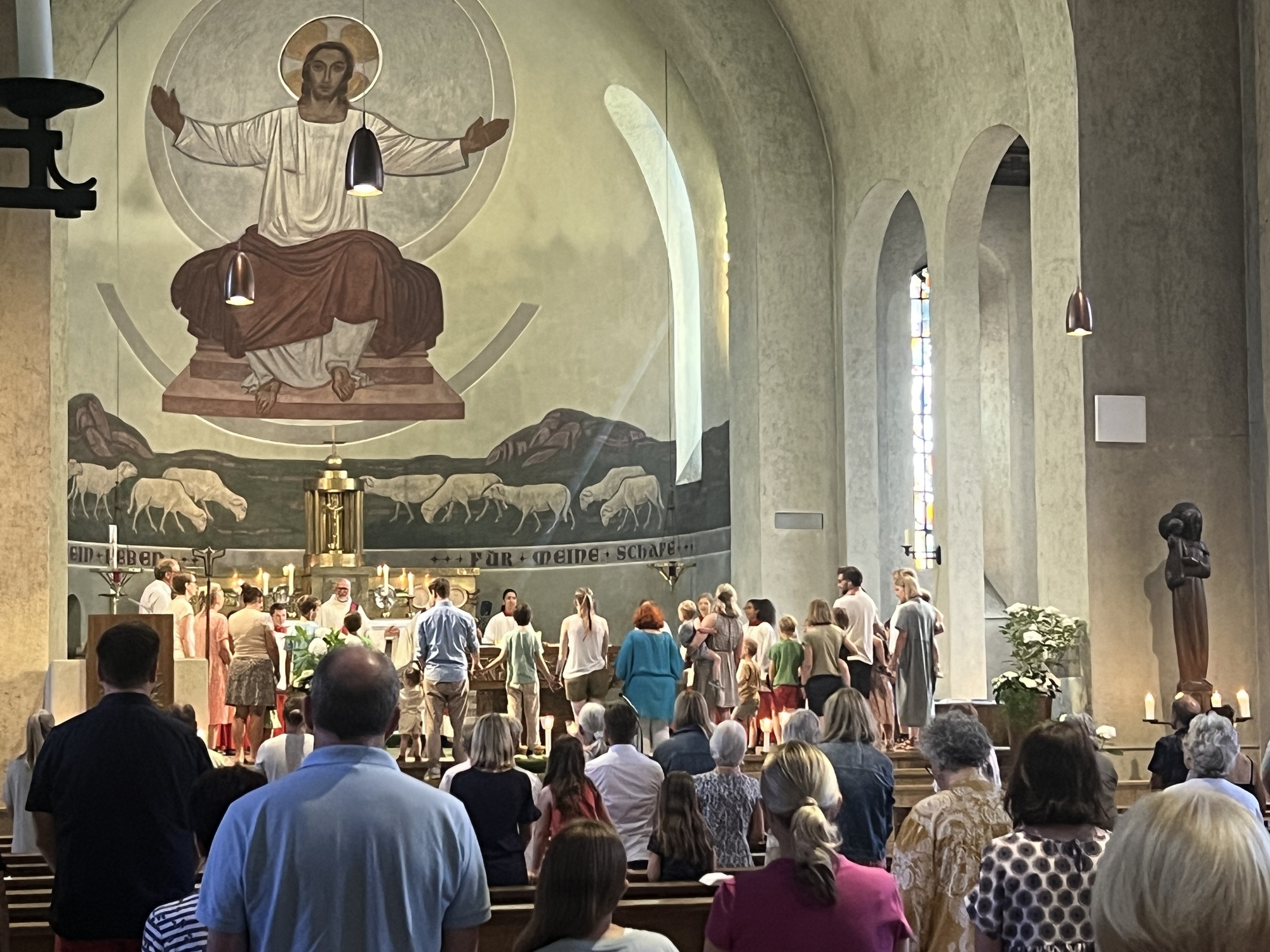 Der Festsonntag begann mit dem Familiengottesdienst in Herz-Jesu, zelebriert von Pfarrer Robert Sauer und Diakon Michael Völker sowie mit dem Team und den Kindern aus der Kita Herz Jesu, die mit einigen Liedern die Messe verschönerten. Anstelle einer Predigt spielten Greta und Jakob die beiden Apostel Paulus und Petrus, deren Gedenktag an diesem Wochenende gefeiert wurde, nach. Die beiden Kinder erzählten eindrucksvoll von deren Werdegang und ihrem Auftrag, Jesus nachzufolgen. Pfarrer Sauer ordnete das Wirken der Apostel kindgerecht ein und stellte die Freunde Jesu mit ihren ganz unterschiedlichen Charakteren vor.