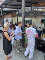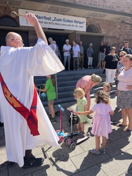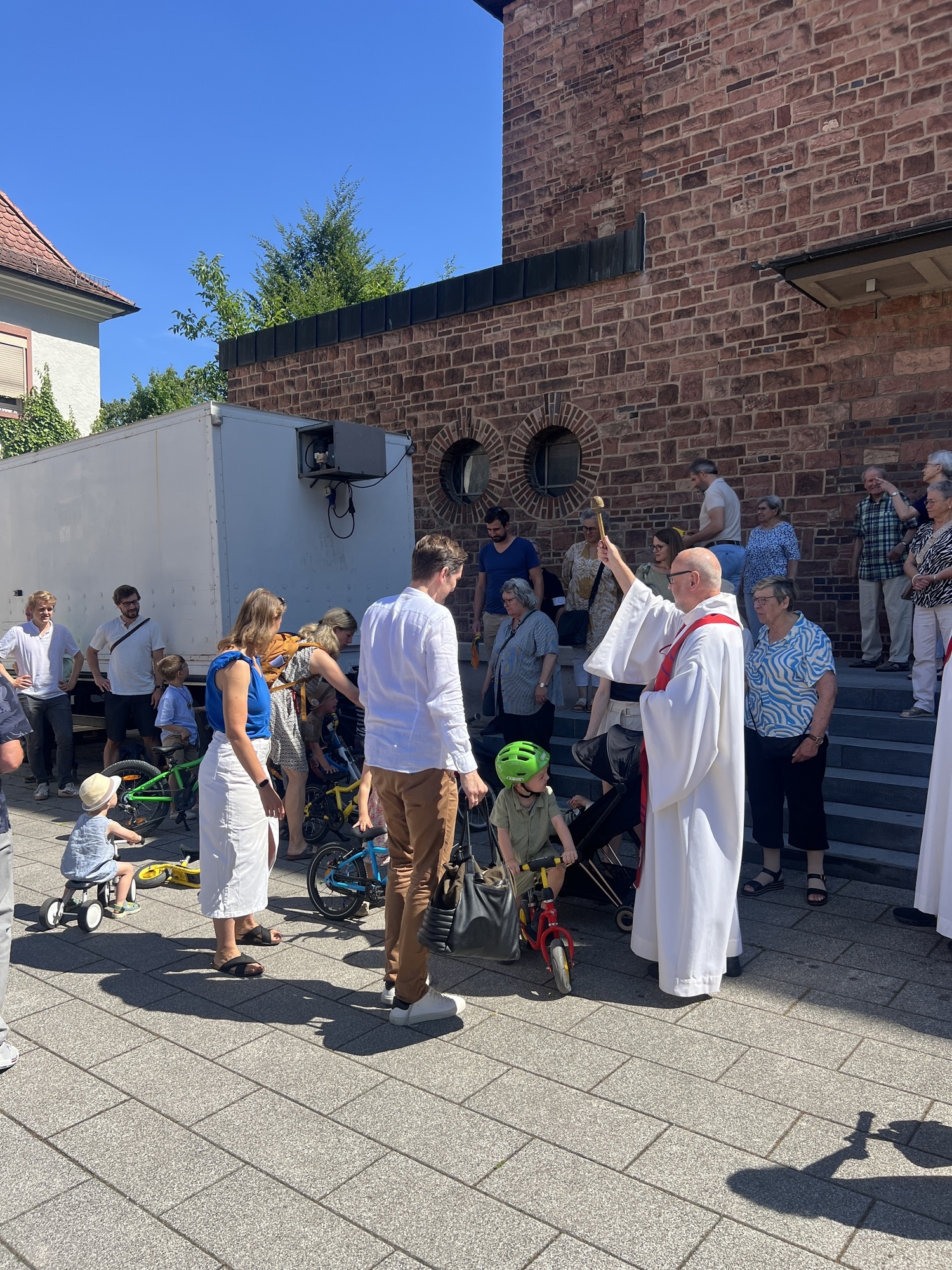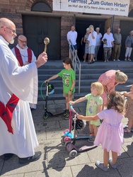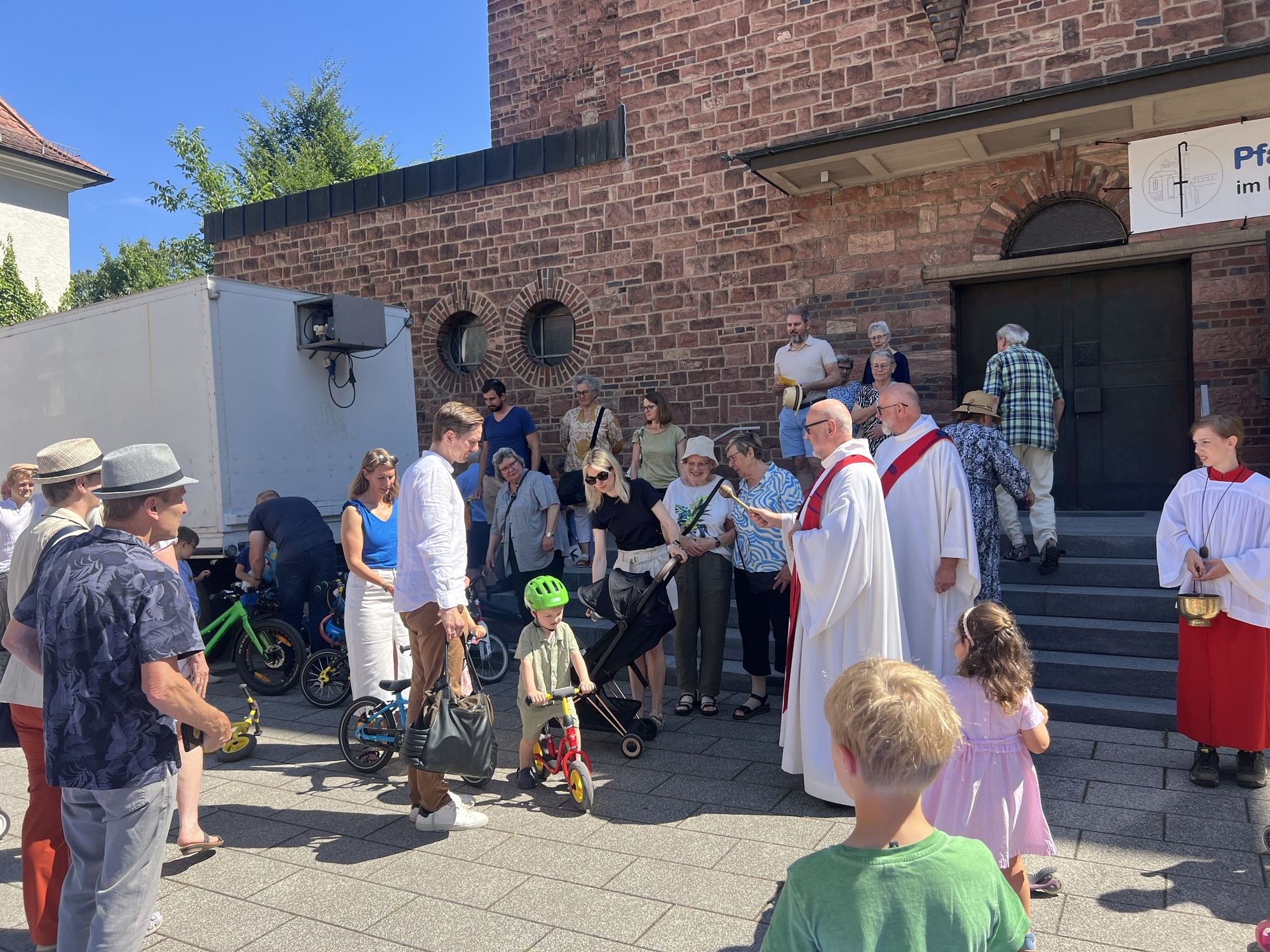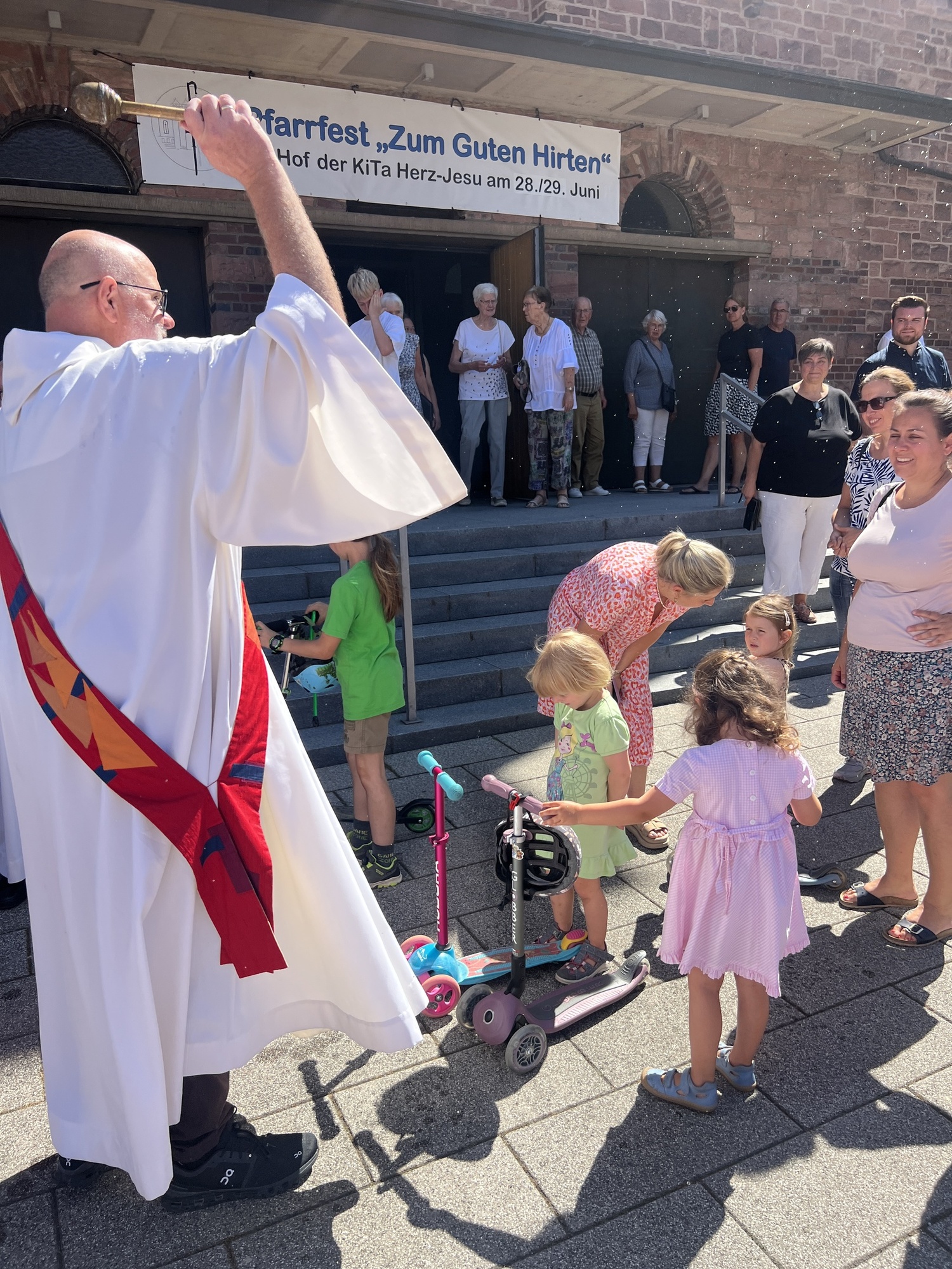 Nach der Messe wurden die Fahrzeuge der Kinder vor der Kirche gesegnet, damit Bobbycar, Dreirad, Roller und Fahrrad stets unfallfrei unterwegs sind. Danach startete der zweite Tag des Pfarrfests. Dank zahlreicher fleißiger ehrenamtlicher Helferinnen und Helfer und dank der vielen Besucher wurde es ein schönes Fest mit guten Begegnungen und Gesprächen bei heißen sommerlichen Temperaturen. Ein herzliches Dankeschön dem gesamten Orga-Team um Thomas Krimm und Alexander Kuhn, den Kitas St. Pius und Herz Jesu für das Kinderprogramm, den Kuchen- und Salatspendern, den Ministrantinnen und Ministranten, die die Hüpfburg und den Zuckerwattestand am Kirchenvorplatz betreuten, sowie allen hier nicht aufgeführten Helfern. Anbei einige Eindrücke von den beiden Festtagen.